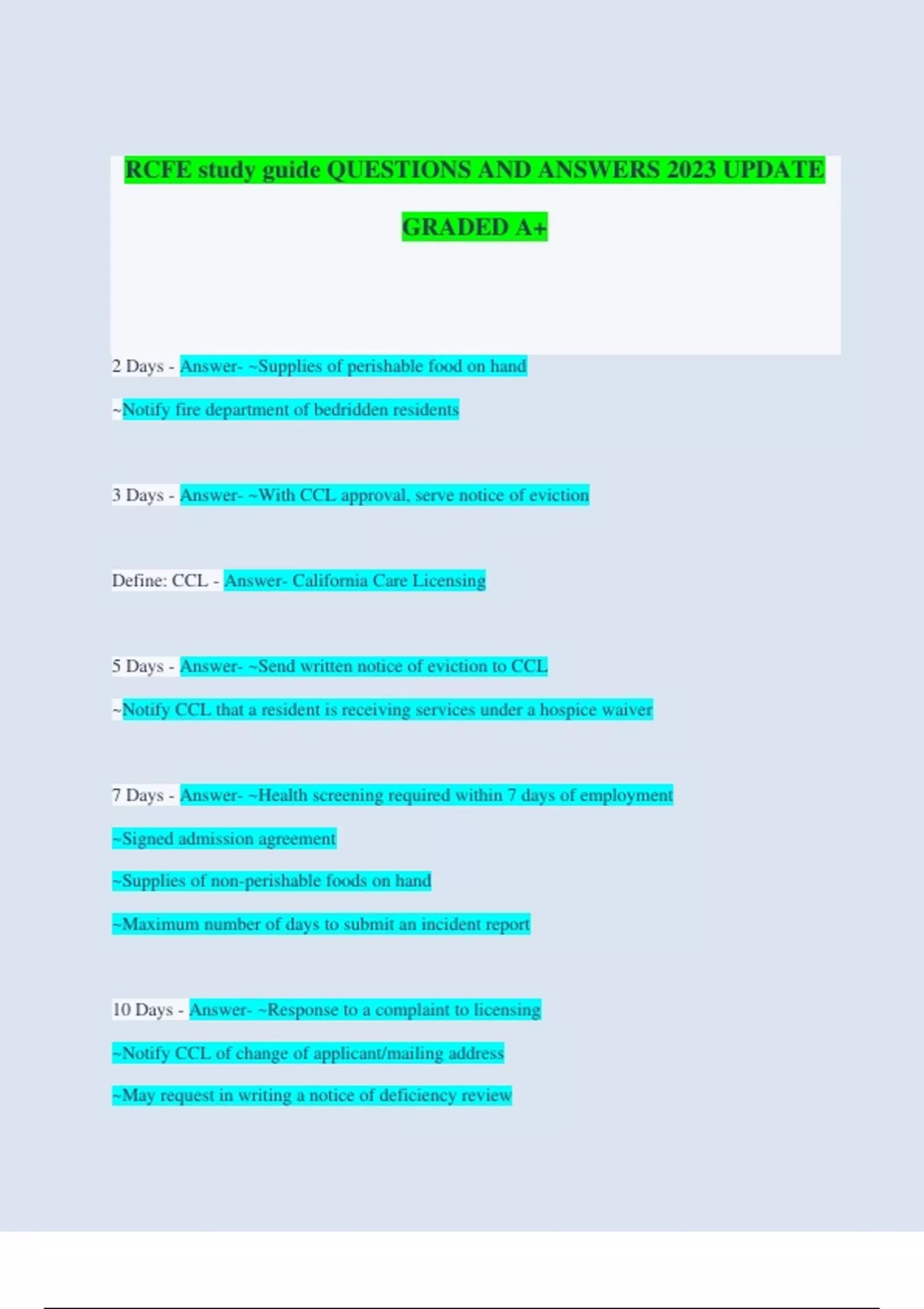 2 Days - Answer- ~Supplies of perishable food on hand ~Notify fire department of bedridden residents 3 Days - Answer- ~With CCL approval, serve notice of eviction Define: CCL - Answer- California Care Licensing 5 Days - Answer- ~Send written notice of eviction to CCL ~Notify CCL that a resident is receiving services under a hospice waiver 7 Days - Answer- ~Health screening required within 7 days of employment ~Signed admission agreement ~Supplies of non-perishable foods on hand ~Maximum number of days to submit an incident report 10 Days - Answer- ~Response to a complaint to licensing ~Notify CCL of change of applicant/mailing address ~May request in writing a notice of deficiency review