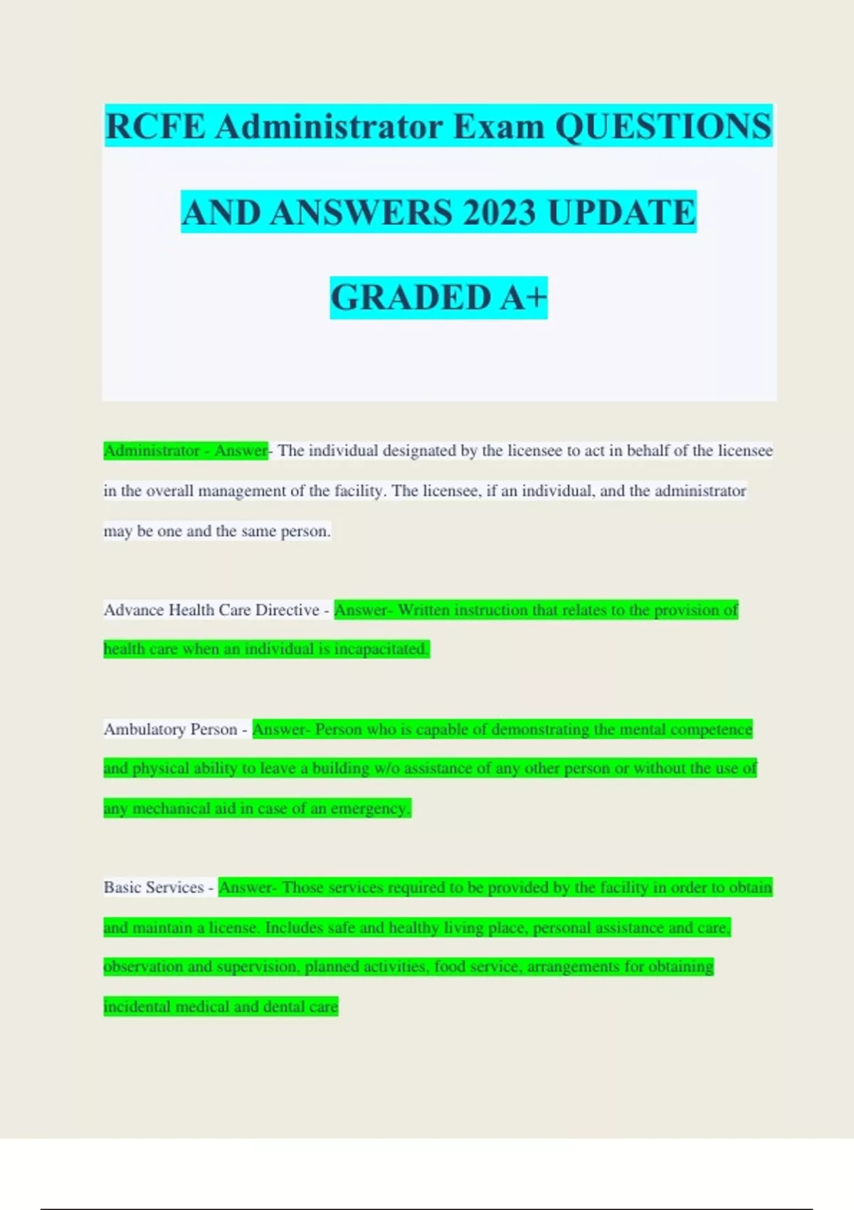 Administrator - Answer- The individual designated by the licensee to act in behalf of the licensee in the overall management of the facility. The licensee, if an individual, and the administrator may be one and the same person. Advance Health Care Directive - Answer- Written instruction that relates to the provision of health care when an individual is incapacitated. Ambulatory Person - Answer- Person who is capable of demonstrating the mental competence and physical ability to leave a building w/o assistance of any other person or without the use of any mechanical aid in case of an emergency. Basic Services - Answer- Those services required to be provided by the facility in order to obtain and maintain a license. Includes safe and healthy living place, personal assistance and care, observation and supervision, planned activities, food service, arrangements for obtaining incidental medical and dental care