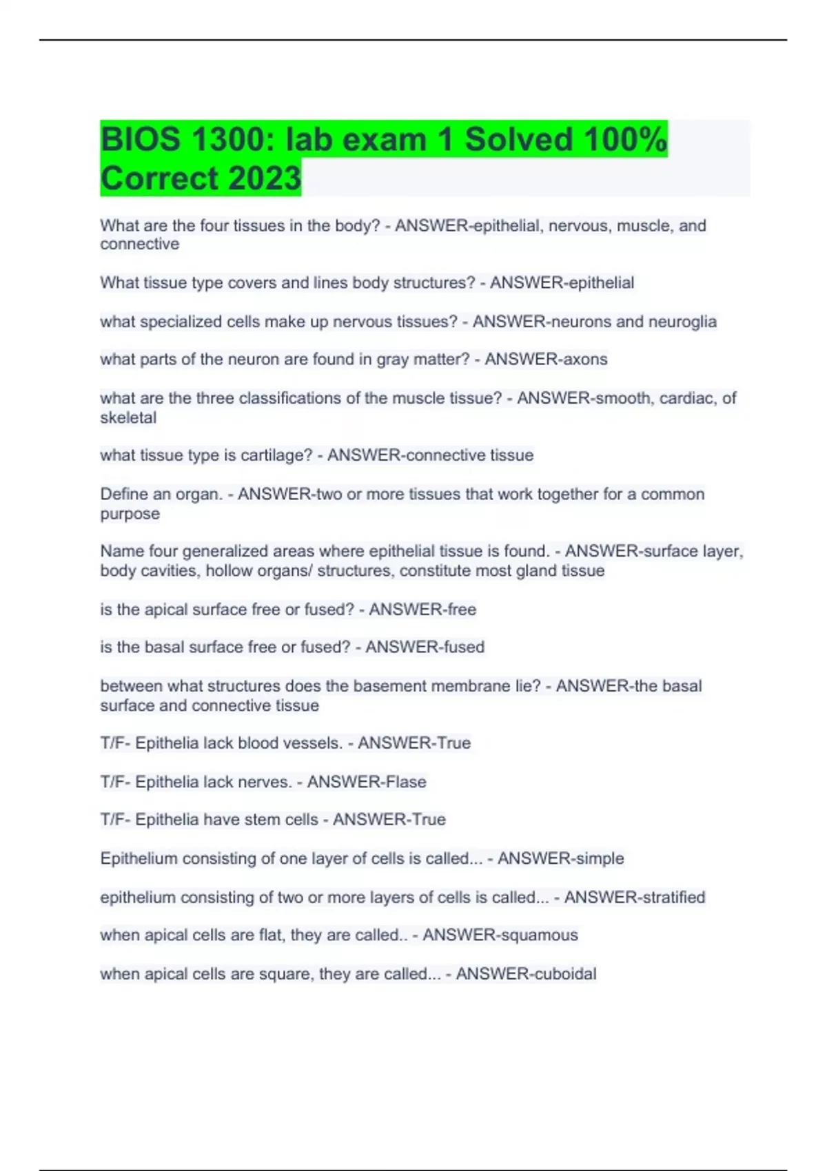 What are the four tissues in the body? - ANSWER-epithelial, nervous, muscle, and connective What tissue type covers and lines body structures? - ANSWER-epithelial what specialized cells make up nervous tissues? - ANSWER-neurons and neuroglia what parts of the neuron are found in gray matter? - ANSWER-axons what are the three classifications of the muscle tissue? - ANSWER-smooth, cardiac, of skeletal what tissue type is cartilage? - ANSWER-connective tissue Define an organ. - ANSWER-two or more tissues that work together for a common purpose Name four generalized areas where epithelial tissue is found. - ANSWER-surface layer, body cavities, hollow organs/ structures, constitute most gland tissue is the apical surface free or fused? - ANSWER-free is the basal surface free or fused? - ANSWER-fused between what structures does the basement membrane lie? - ANSWER-the basal surface and connective tissue T/F- Epithelia lack blood vessels. - ANSWER-True T/F- Epithelia lack nerves. - ANSWER-Flase T/F- Epithelia have stem cells - ANSWER-True Epithelium consisting of one layer of cells is called... - ANSWER-simple epithelium consisting of two or more layers of cells is called... - ANSWER-stratified when apical cells are flat, they are called.. - ANSWER-squamous when apical cells are square, they are called... - ANSWER-cuboidal when apical cells are rectangular, they are called... - ANSWER-columnar what is unique about transitional