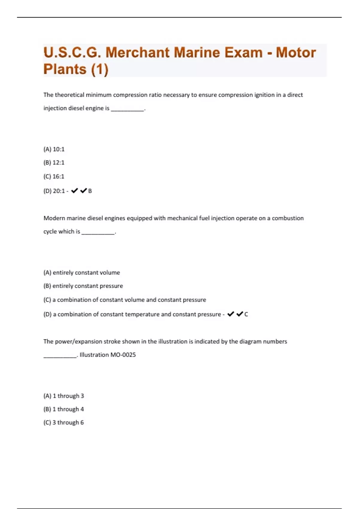 The theoretical minimum compression ratio necessary to ensure compression ignition in a direct injection diesel engine is __________. (A) 10:1 (B) 12:1 (C) 16:1 (D) 20:1 - B Modern marine diesel engines equipped with mechanical fuel injection operate on a combustion cycle which is __________. (A) entirely constant volume (B) entirely constant pressure (C) a combination of constant volume and constant pressure (D) a combination of constant temperature and constant pressure - C The power/expansion stroke shown in the illustration is indicated by the diagram numbers __________. Illustration MO-0025 (A) 1 through 3 (B) 1 through 4 (C) 3 through 6(D) 4 through 6 - A The start of fuel oil injection into the cylinder of a four-stroke cycle diesel engine occurs during the __________. (A) intake stroke (B) exhaust stroke (C) power stroke (D) compression stroke -D If the piston stroke in a four-stroke cycle diesel engine is 10 1/2 inches and the speed of rotation of the crankshaft is 720 RPM, what is the average piston speed? (A) 1200 feet/minute (B) 1260 feet/minute (C) 1320 feet/minute (D) 1380 feet/minute - B of 37 Q531 Motor Plants IThird Assistant Engineer Q531 Motor Plants I Illustrations: 21 Which of the following conditions would NOT be considered a valid reason for the diesel engine to operate in the area indicated by letter "B" shown in the illustration? Illustration MO-0126 (A) Operating the vessel against high winds and current (B) Operating with a fouled or damaged propeller (C) Operating the vessel in shallow water (D) Operating with minimal hull drag and under light draft - D The indicator card shown in the illustration is produced with a/an __________. Illustration MO-0108 (A) oscillating drum (B) sliding camshaft (C) rotating drum (D) balanced-diaphragm indicator - C