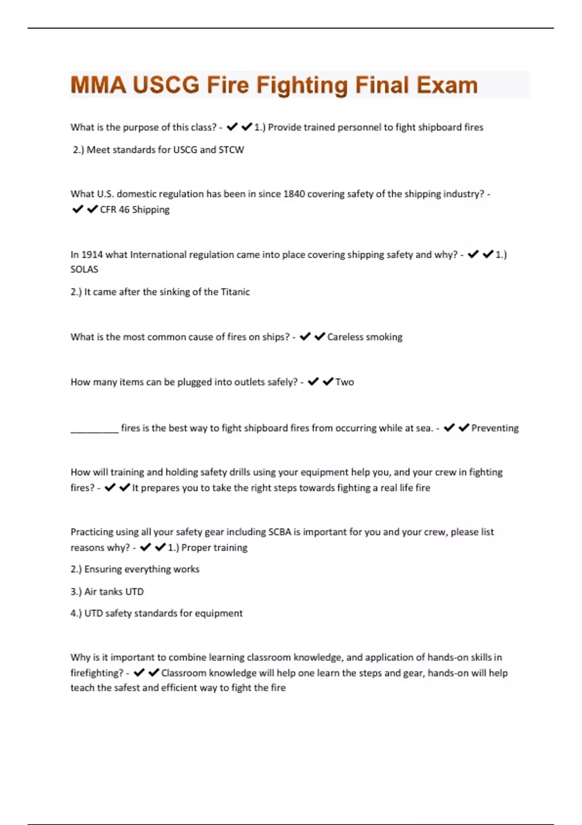 What is the purpose of this class? - 1.) Provide trained personnel to fight shipboard fires 2.) Meet standards for USCG and STCW What U.S. domestic regulation has been in since 1840 covering safety of the shipping industry? - CFR 46 Shipping In 1914 what International regulation came into place covering shipping safety and why? - 1.) SOLAS 2.) It came after the sinking of the Titanic What is the most common cause of fires on ships? - Careless smoking How many items can be plugged into outlets safely? - Two _________ fires is the best way to fight shipboard fires from occurring while at sea. - Preventing How will training and holding safety drills using your equipment help you, and your crew in fighting fires? - It prepares you to take the right steps towards fighting a real life fire Practicing using all your safety gear including SCBA is important for you and your crew, please list reasons why? - 1.) Proper training 2.) Ensuring everything works 3.) Air tanks UTD 4.) UTD safety standards for equipment Why is it important to combine learning classroom knowledge, and application of hands-on skills in firefighting? - Classroom knowledge will help one learn the steps and gear, hands-on will help teach the safest and efficient way to fight the fireWhy is it important after every drill or incident to hold discussions with all crew members about the drill or incident? - So the crew can discuss what went right and what went wrong, and ways things can change to make everything run smoothly and safely Protective clothing is also known as what? - 1.) PPE (personal protective equipment) 2.) Turnout gear Protective clothing provides limited protection to enter hazardous environments using what protection method? - Layers Protective clothing can fail to protect a firefighter when it reaches what temperature? - 1200°F Full protective clothing adds how much weight to the firefighter? - 70 lbs Full protective clothing includes the use of ______ to protect your respiratory system? - SCBA What does SCBA stand for? - Self Contained Breathing Apparatus