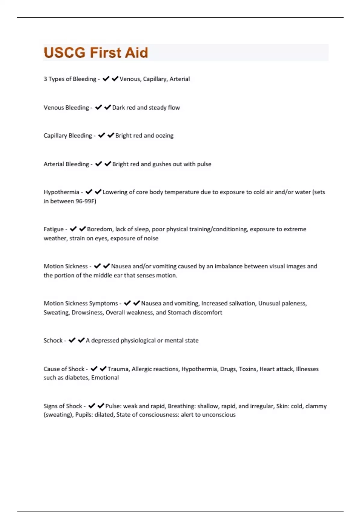 3 Types of Bleeding - Venous, Capillary, Arterial Venous Bleeding - Dark red and steady flow Capillary Bleeding - Bright red and oozing Arterial Bleeding - Bright red and gushes out with pulse Hypothermia - Lowering of core body temperature due to exposure to cold air and/or water (sets in between 96-99F) Fatigue - Boredom, lack of sleep, poor physical training/conditioning, exposure to extreme weather, strain on eyes, exposure of noise Motion Sickness - Nausea and/or vomiting caused by an imbalance between visual images and the portion of the middle ear that senses motion. Motion Sickness Symptoms - Nausea and vomiting, Increased salivation, Unusual paleness, Sweating, Drowsiness, Overall weakness, and Stomach discomfort Schock - A depressed physiological or mental state Cause of Shock - Trauma, Allergic reactions, Hypothermia, Drugs, Toxins, Heart attack, Illnesses such as diabetes, Emotional Signs of Shock - Pulse: weak and rapid, Breathing: shallow, rapid, and irregular, Skin: cold, clammy (sweating), Pupils: dilated, State of consciousness: alert to unconsciousShock Symptoms - Restlessness, Fainting, Thirst, Nausea, Weakness, Anxiousness, Fright, Dizzines