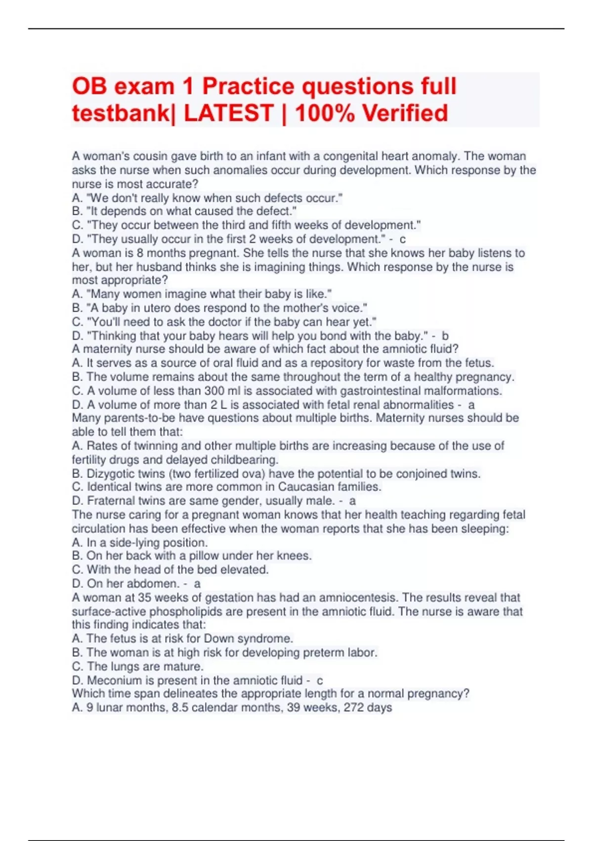 OB exam 1 Practice questions full testbank| LATEST | 100% Verified A woman's cousin gave birth to an infant with a congenital heart anomaly. The woman asks the nurse when such anomalies occur during development. Which response by the nurse is most accurate? A. "We don't really know when such defects occur." B. "It depends on what caused the defect." C. "They occur between the third and fifth weeks of development." D. "They usually occur in the first 2 weeks of development." - c A woman is 8 months pregnant. She tells the nurse that she knows her baby listens to her, but her husband thinks she is imagining things. Which response by the nurse is most appropriate? A. "Many women imagine what their baby is like." B. "A baby in utero does respond to the mother's voice." C. "You'll need to ask the doctor if the baby can hear yet." D. "Thinking that your baby hears will help you bond with the baby." - b A maternity nurse should be aware of which fact about the amniotic fluid? A. It serves as a source of oral fluid and as a repository for waste from the fetus. B. The volume remains about the same throughout the term of a healthy pregnancy. C. A volume of less than 300 ml is associated with gastrointestinal malformations. D. A volume of more than 2 L is associated with fetal renal abnormalities - a Many parents-to-be have questions about multiple births. Maternity nurses should be able to tell them that: A. Rates of twinning and other multiple births are increasing because of the use of fertility drugs and delayed childbearing. B. Dizygotic twins (two fertilized ova) have the potential to be conjoined twins. C. Identical twins are more common in Caucasian families. D. Fraternal twins are same gender, usually male. - a The nurse caring for a pregnant woman knows that her health teaching regarding fetal circulation has been effective when the woman reports that she has been sleeping: A. In a side-lying position. B. On her back with a pillow under her knees. C. With the head of the bed elevated. D. On her abdomen. - a A woman at 35 weeks of gestation has had an amniocentesis. The results reveal that surface-active phospholipids are present in the amniotic fluid. The nurse is aware that this finding indicates that: A. The fetus is at risk for Down syndrome. B. The woman is at high risk for developing preterm labor. C. The lungs are mature. D. Meconium is present in the amniotic fluid - c Which time span delineates the appropriate length for a normal pregnancy? A. 9 lunar months, 8.5 calendar months, 39 weeks, 272 days B. 10 lunar months, 9 calendar months, 40 weeks, 280 days C. 9 calendar months, 10 lunar months, 42 weeks, 294 days D. 9 calendar months, 38 weeks, 266 days - b A pregnant woman has been diagnosed with oligohydramnios. Which presentation would the nurse suspect to find on physical examination? A. Fetus is in a breech position B. FHR baseline is within normal range C. Fetus with possible renal problems D. Increased fundal height - c Which developmental finding is accurate with regard to fetal growth? A. Heart starts beating at 12 weeks. B. Lungs take shape by 8 weeks. C. Brain configuration is complete by 8 weeks. D. Main blood vessels form by 8 weeks - d In reviewing the history of a woman who wants to become pregnant, which medication profile would indicate a potential concern relative to toxic exposure? (Select all that apply.) A. Tylenol OTC occasionally for a headache; twice last week B. Anticonvulsant for seizure disorder C. Lithium for bipolar disorder D. Coumadin for atrial fibrillation E. Multivitamins once a day - b,c,d A woman is 6 weeks pregnant. She has had a previous spontaneous abortion at 14 weeks of gestation and a pregnancy that ended at 38 weeks with the birth of a stillborn girl. What is her gravidity and parity according to the GTPAL system? A. 2-0-0-1-1 B. 2-1-0-1-0 C. 3-1-0-1-0 D. 3-0-1-1-0 - c Over-the-counter (OTC) pregnancy tests usually rely on which technology to test for human chorionic gonadotropin (hCG)? A. Radioimmunoassay B. Radioreceptor assay C. Latex agglutination test D. Enzyme-linked immunosorbent assay (ELISA) - d A nurse teaches a pregnant woman about the presumptive, probable, and positive signs of pregnancy. The woman demonstrates understanding of the nurse's instructions if she states that a positive sign of pregnancy is: A. A positive pregnancy test result. B. Fetal movement palpated by the nurse-midwife. C. Braxton Hicks contractions. D. Quickening. - b During a client's physical examination, the nurse notes that the lower uterine segment is soft on palpation. The nurse would document this finding as: A. Hegar sign. B. McDonald sign. C. Chadwick sign. D. Goodell sign. - a Cardiovascular system changes occur during pregnancy. Which finding would be considered normal for a woman in her second trimester? A. Less audible heart sounds (S1, S2) B. Increased pulse rate C. Increased blood pressure D. Decreased red blood cell (RBC) production - b A woman who has completed one pregnancy with a fetus (or fetuses) reaching the stage of fetal viability is called a: A. Primipara B. Primigravida C. Multipara D. Nulligravida - a Which presumptive sign (felt by woman) or probable sign (observed by the examiner) of pregnancy is not matched with another possible cause(s)? A. Amenorrhea—stress, endocrine problems B. Quickening—gas, peristalsis C. Goodell sign—cervical polyps D. Chadwick sign—pelvic congestion - c In order to reassure and educate pregnant clients about changes in their blood pressure, maternity nurses should be aware that: A. A blood pressure cuff that is too small produces a reading that is too low; a cuff that is too large produces a reading that is too high. B. Shifting the client's position and changing from arm to arm for different measurements produces the most accurate composite blood pressure reading at each visit. C. The systolic blood pressure increases slightly as pregnancy advances; the diastolic pressure remains constant. D. C