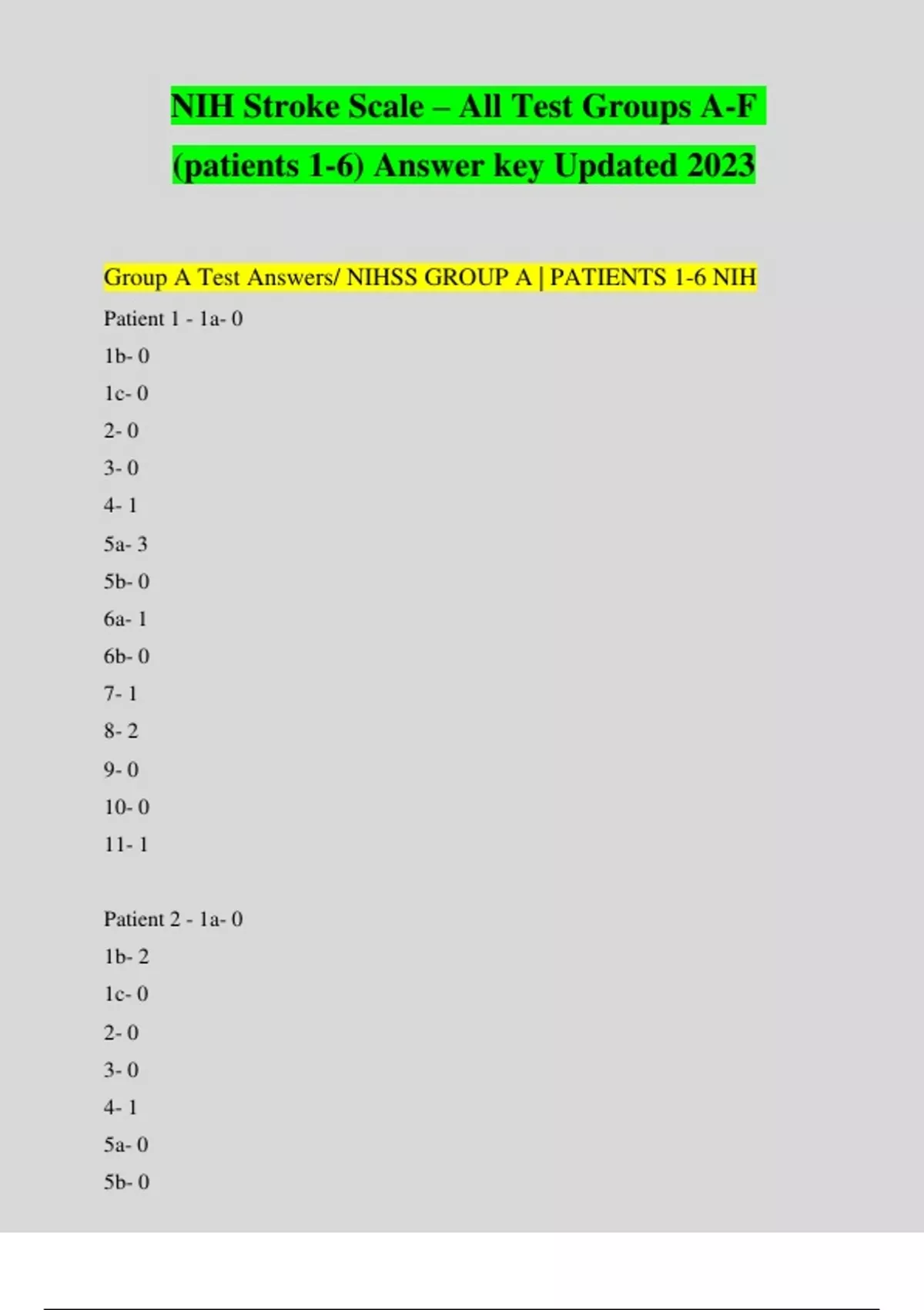 NIH Stroke Scale – All Test Groups A-F (patients 1-6) Answer key Updated 2023