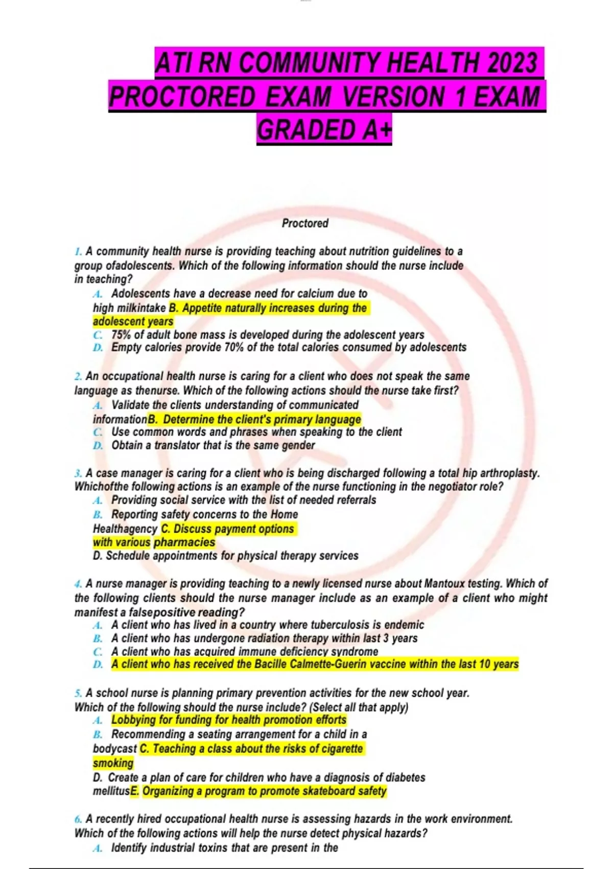ATI RN COMMUNITY HEALTH 2023 PROCTORED EXAM VERSION 1 EXAM GRADED A+