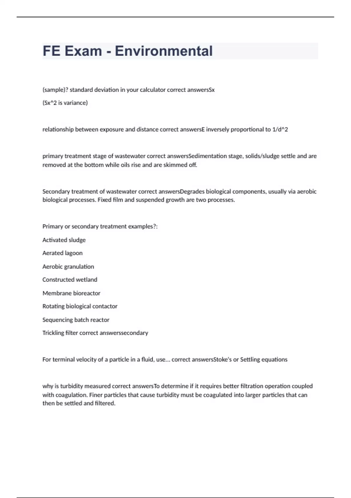(sample)? standard deviation in your calculator correct answersSx (Sx^2 is variance) relationship between exposure and distance correct answersE inversely proportional to 1/d^2 primary treatment stage of wastewater correct answersSedimentation stage, solids/sludge settle and are removed at the bottom while oils rise and are skimmed off. Secondary treatment of wastewater correct answersDegrades biological components, usually via aerobic biological processes. Fixed film and suspended growth are two processes. Primary or secondary treatment examples?: Activated sludge Aerated lagoon Aerobic granulation Constructed wetland Membrane bioreactor Rotating biological contactor Sequencing batch reactor Trickling filter correct answerssecondary For terminal velocity of a particle in a fluid, use... correct answersStoke's or Settling equations why is turbidity measured correct answersTo determine if it requires better filtration operation coupled with coagulation. Finer particles that cause turbidity must be coagulated into larger particles that can then be settled and filtered.