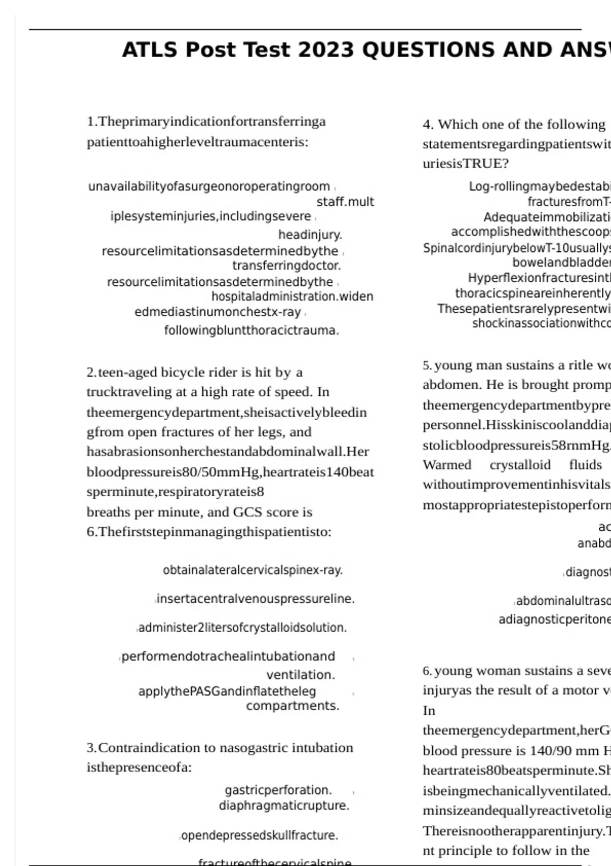 ATLS Post Test 2023 QUESTIONS AND ANSWERS(WITH COMPLETE SOLUTION) ATLS Post Test 2023 QUESTIONS AND ANSWERS 1.Theprimaryindicationfortransferringa patienttoahigherleveltraumacenteris: 4. Which one of the following statementsregardingpatientswiththoracicspineinj uriesisTRUE? unavailabilityofasurgeonoroperatingroom iplesysteminjuries,includingsevere headinjury. resourcelimitationsasdeterminedbythe transferringdoctor. resourcelimitationsasdeterminedbythe edmediastinumonchestx-ray followingbluntthoracictrauma. -aged bicycle rider is hit by a trucktraveling at a high rate of speed. In theemergencydepartment,sheisactivelybleedin gfrom open fractures of her legs, and hasabrasionsonherchestandabdominalwall.Her bloodpressureis80/50mmHg,heartrateis140beat sperminute,respiratoryrateis8 breaths per minute, and GCS score is 6.Thefirststepinmanagingthispatientisto: obtainalateralcervicalspinex-ray. insertacentralvenouspressureline. administer2litersofcrystalloidsolution. performendotrachealintubationand  ventilation. applythePASGandinflatetheleg  compartments. 3.Contraindication to nasogastric intubation isthepresenceofa: gastricperforation.  diaphragmaticrupture. opendepressedskullfracture. fractureofthecervicalspine. fracture of the cribriformplate.  Log-rollingmaybedestabilizingto  fracturesfromT-12toL-1. Adequateimmobilizationcanbe  accomplishedwiththescoopstretcher. SpinalcordinjurybelowT-10usuallyspares  bowelandbladderfunction. Hyperflexionfracturesintheupper  thoracicspineareinherentlyunstable. Thesepatientsrarelypresentwithspinal  shockinassociationwithcordinjury. 5. young man sustains a ritle wound to the midabdomen. He is brought promptly to theemergencydepartmentbyprehospital personnel.Hisskiniscoolanddiaphoretic,andhissy stolicbloodpressureis58rnmHg. Warmed crystalloid fluids are initiated withoutimprovementinhisvitalsigns.Thenext, mostappropriatestepistoperform: aceliotomy.  anabdominalCTscan. diagnosticlaparoscopy. abdominalultrasonography.  adiagnosticperitoneallavage. 