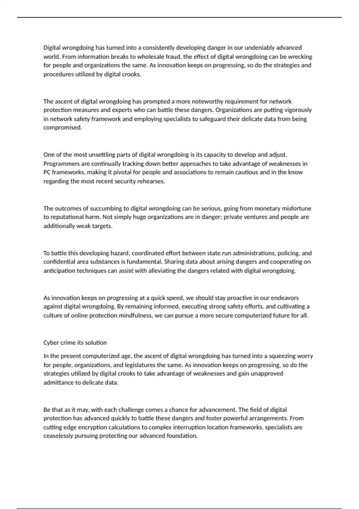 Cyber crime poses a significant threat to individuals, organizations, and society as a whole. By implementing robust cybersecurity measures, promoting education and awareness, fostering collaboration, and enacting effective legislation, we can collectively combat cybercrime and create a safer digital environment. However, it's important to recognize that cyber threats are constantly evolving, and ongoing efforts are required to stay ahead of cybercriminals and protect against emerging risks.