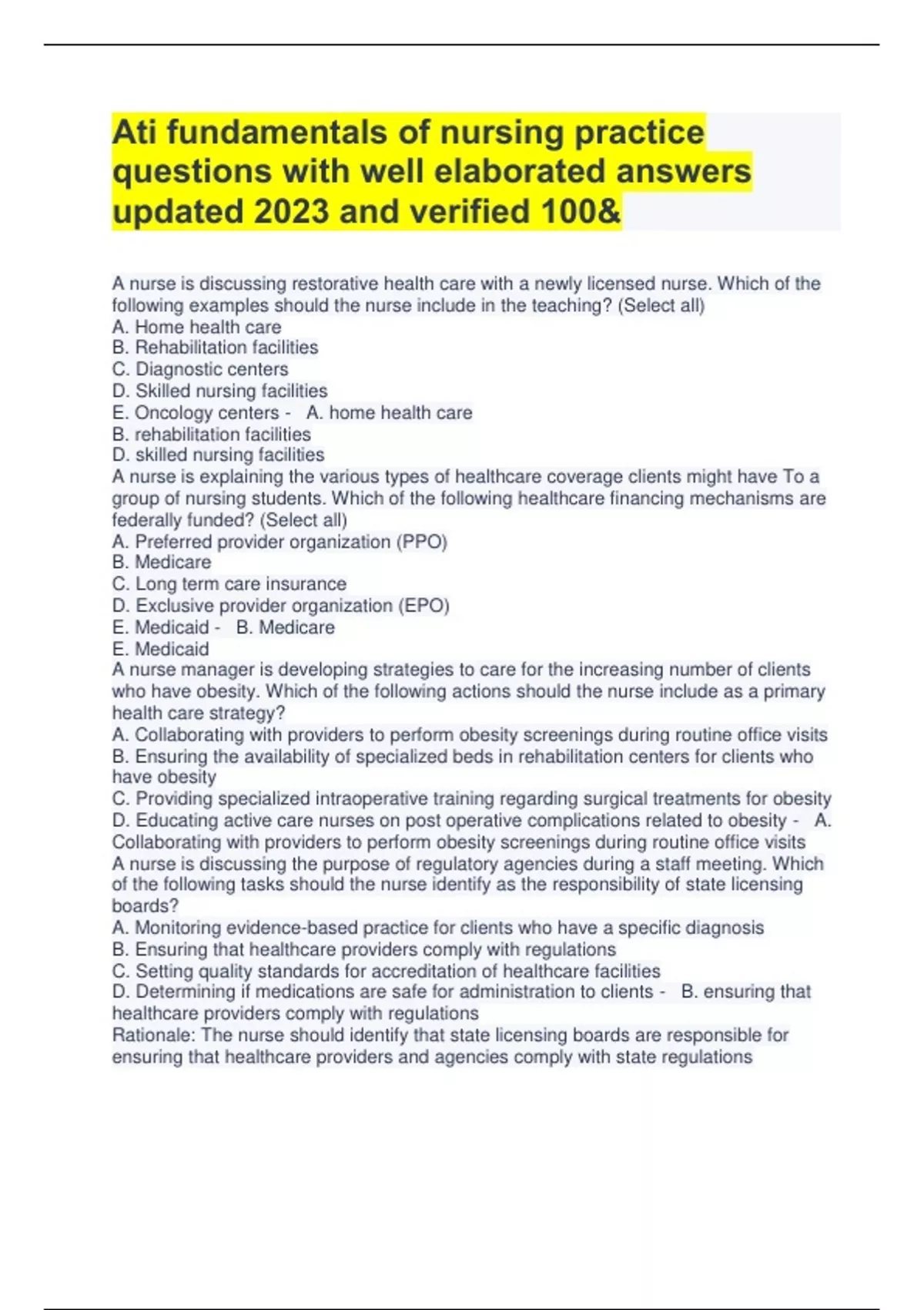 Ati fundamentals of nursing practice questions with well elaborated answers updated 2023 and verified 100& A nurse is discussing restorative health care with a newly licensed nurse. Which of the following examples should the nurse include in the teaching? (Select all) A. Home health care B. Rehabilitation facilities C. Diagnostic centers D. Skilled nursing facilities E. Oncology centers - A. home health care B. rehabilitation facilities D. skilled nursing facilities A nurse is explaining the various types of healthcare coverage clients might have To a group of nursing students. Which of the following healthcare financing mechanisms are federally funded? (Select all) A. Preferred provider organization (PPO) B. Medicare C. Long term care insurance D. Exclusive provider organization (EPO) E. Medicaid - B. Medicare E. Medicaid A nurse manager is developing strategies to care for the increasing number of clients who have obesity. Which of the following actions should the nurse include as a primary health care strategy? A. Collaborating with providers to perform obesity screenings during routine office visits B. Ensuring the availability of specialized beds in rehabilitation centers for clients who have obesity C. Providing specialized intraoperative training regarding surgical treatments for obesity D. Educating active care nurses on post operative complications related to obesity - A. Collaborating with providers to perform obesity screenings during routine office visits A nurse is discussing the purpose of regulatory agencies during a staff meeting. Which of the following tasks should the nurse identify as the responsibility of state licensing boards? A. Monitoring evidence-bas