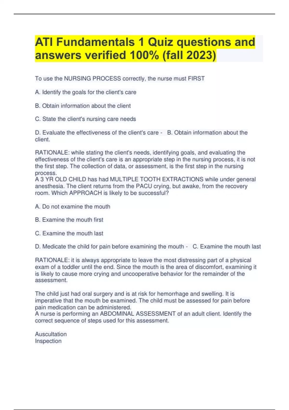 ATI Fundamentals 1 Quiz questions and answers verified 100% (fall 2023) To use the NURSING PROCESS correctly, the nurse must FIRST A. Identify the goals for the client's care B. Obtain information about the client C. State the client's nursing care needs D. Evaluate the effectiveness of the client's care - B. Obtain information about the client. RATIONALE: while stating the client's needs, identifying goals, and evaluating the effectiveness of the client's care is an appropriate step in the nursing process, it is not the first step. The collection of data, or assessment, is the first step in the nursing process. A 3 YR OLD CHILD has had MULTIPLE TOOTH EXTRACTIONS while under general anesthesia. The client returns from the PACU crying, but awake, from the recovery room. Which APPROACH is likely to be successful? A. Do not examine the mouth B. Examine the mouth first C. Examine the mouth last D. Medicate the child for pain before examining the mouth - C. Examine the mouth last RATIONALE: it is always appropriate to leave the most distressing part of a physical exam of a toddler until the end. Since the mouth is the area of discomfort, examining it is likely to cause more crying and uncooperative behavior for the remainder of the assessment.