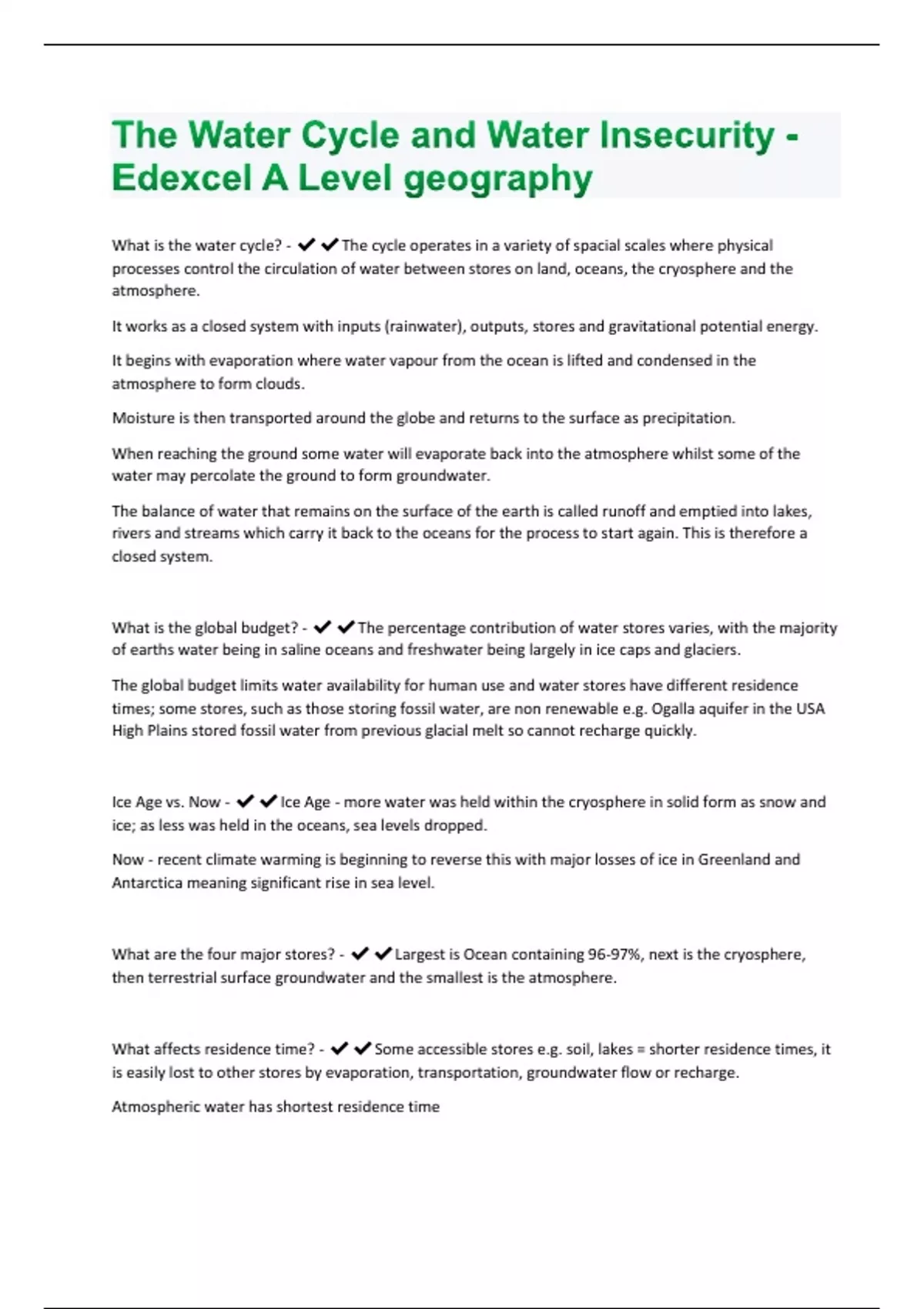 The Water Cycle and Water Insecurity - Edexcel A Level geography questions and answers)complete