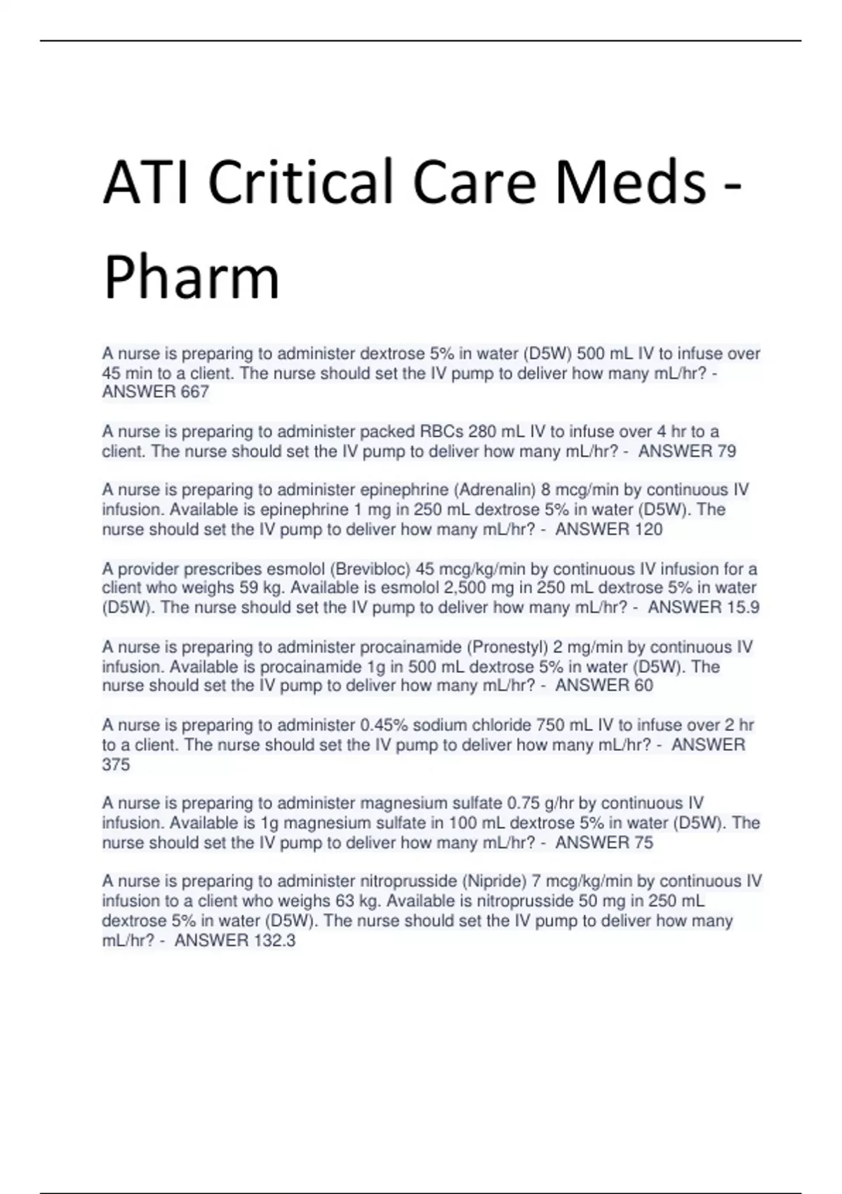 ATI Critical Care Meds - Pharm A nurse is preparing to administer dextrose 5% in water (D5W) 500 mL IV to infuse over 45 min to a client. The nurse should set the IV pump to deliver how many mL/hr? - ANSWER 667 A nurse is preparing to administer packed RBCs 280 mL IV to infuse over 4 hr to a client. The nurse should set the IV pump to deliver how many mL/hr? - ANSWER 79 A nurse is preparing to administer epinephrine (Adrenalin) 8 mcg/min by continuous IV infusion. Available is epinephrine 1 mg in 250 mL dextrose 5% in water (D5W). The nurse should set the IV pump to deliver how many mL/hr? - ANSWER 120 A provider prescribes esmolol (Brevibloc) 45 mcg/kg/min by continuous IV infusion for a client who weighs 59 kg. Available is esmolol 2,500 mg in 250 mL dextrose 5% in water (D5W). The nurse should set the IV pump to deliver how many mL/hr? - ANSWER 15.9 A nurse is preparing to administer procainamide (Pronestyl) 2 mg/min by continuous IV infusion. Available is procainamide 1g in 500 mL dextrose 5% in water (D5W). The nurse should set the IV pump to deliver how many mL/hr? - ANSWER 60 A nurse is preparing to administer 0.45% sodium chloride 750 mL IV to infuse over 2 hr to a client. The nurse should set the IV pump to deliver how many mL/hr? - ANSWER 375 A nurse is preparing to administer magnesium sulfate 0.75 g/hr by continuous IV infusion. Available is 1g magnesium sulfate in 100 mL dextrose 5% in water (D5W). The nurse should set the IV pump to deliver how many mL/hr? - ANSWER 75 A nurse is preparing to administer nitroprusside (Nipride) 7 mcg/kg/min by continuous IV infusion to a client who weighs 63 kg. Available is nitroprusside 50 mg in 250 mL dextrose 5% in water (D5W). The nurse should set the IV pump to deliver how many mL/hr? - ANSWER 132.3