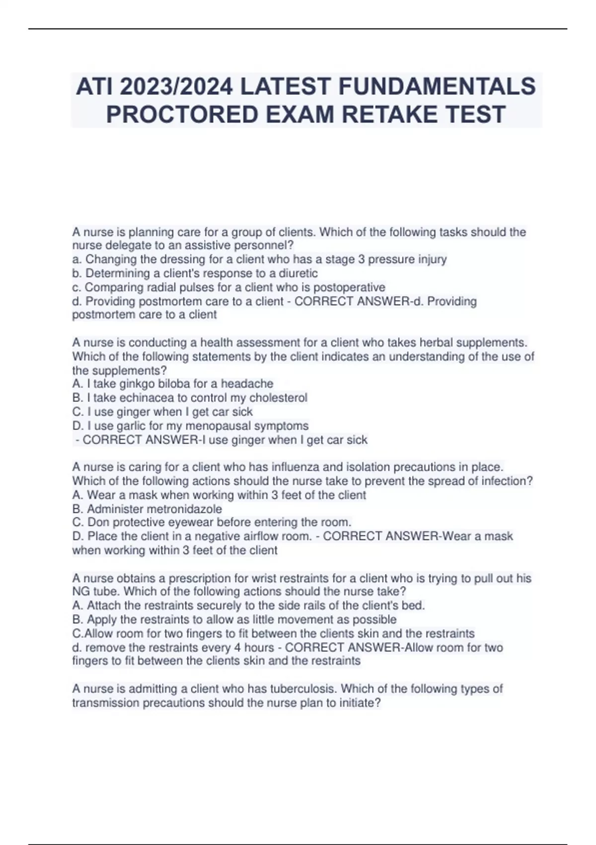 ATI 2023/2024 LATEST FUNDAMENTALS PROCTORED EXAM RETAKE TEST A nurse is planning care for a group of clients. Which of the following tasks should the nurse delegate to an assistive personnel? a. Changing the dressing for a client who has a stage 3 pressure injury b. Determining a client's response to a diuretic c. Comparing radial pulses for a client who is postoperative d. Providing postmortem care to a client - CORRECT ANSWER-d. Providing postmortem care to a client A nurse is conducting a health assessment for a client who takes herbal supplements. Which of the following statements by the client indicates an understanding of the use of the supplements? A. I take ginkgo biloba for a headache B. I take echinacea to control my cholesterol C. I use ginger when I get car sick D. I use garlic for my menopausal symptoms - CORRECT ANSWER-I use ginger when I get car sick A nurse is caring for a client who has influenza and isolation precautions in place. Which of the following actions should the nurse take to prevent the spread of infection? A. Wear a mask when working within 3 feet of the client B. Administer metronidazole C. Don protective eyewear before entering the room. D. Place the client in a negative airflow room. - CORRECT ANSWER-Wear a mask when working within 3 feet of the client A nurse obtains a prescription for wrist restraints for a client who is trying to pull out his NG tube. Which of the following actions should the nurse take? A. Attach the restraints securely to the side rails of the client's bed. B. Apply the restraints to allow as little movement as possible C.Allow room for two fingers to fit between the clients skin and the restraints d. remove the restraints every 4 hours - CORRECT ANSWER-Allow room for two fingers to fit between the clients skin and the restraints A nurse is admitting a client who has tuberculosis. Which of the following types of transmission precautions should the nurse plan to initiate? A. Droplet B. Airborne c. protective environment d. contact - CORRECT ANSWER-Airborne A nurse in a well-child clinic receives a telephone call from a parent who states that their child accidentally swallowed paint thinner. The child is awake and alert. Which of the following responses should the nurse make? A. Have your child drink one large glass of water. B. Hang up and call a poison control center hotline. C. Bring your child into the clinic later today. D. Induce vomiting in your child with syrup of ipecac. - CORRECT ANSWER-Have your child drink one large glass of water A nurse is documenting a client's medical record. Which of the following entries should the nurse record. A. Oral temperature slightly elevated at 0800 B. Administered pain medication C. Incision without redness or drainage D. Drank adequate amounts of fluid with meals. - CORRECT ANSWER-Administered pain medication A nurse is providing oral care for a client who is unconscious. Which of the following actions should the nurse take? A. Place the client in a side-lying position. B. Brush the clients teeth daily C. Apply mineral oil to the client's lips D. Rinse the client's mouth with an alcohol-based mouthwash - CORRECT ANSWERPlace the client in a side-lying position A nurse is collaborating with a risk management team about potential legal issues involving client care. The nurse should identify which of the following situations is an example of negligence? A. A nurse administers a medication without first identifying the client. B. An assistive personnel discusses client care in the facility cafeteria with visitors present. C. A nurse begins a blood transfusion without obtaining consent. D. An assistive personnel prevents a client from leaving the facility. - CORRECT ANSWER-A nurse begins a blood transfusion without obtaining consent A nurse is collecting a sputum specimen for culture from a client who has a respiratory infection. Which of the following actions should the nurse take? A. Wear sterile gloves when collecting the specimen. B. Offer the client oral hygiene after the collection C. Collect the specimen in the evening. D Collect 1 ml of sputum. - CORRECT ANSWER-Offer the client oral hygiene after the collection A nurse is assessing an older client. Which of the following findings should the nurse expect? a. Decreased sense of balance b. Increased nighttime sleeping c. Heightened sense of pain d. Nighttime urinary incontinence - CORRECT ANSWER-Decreased sense of balance A nurse is completing discharge teaching about ostomy care with a client who has a new stoma. Which of the following instructions should the nurse include in the teaching? (select all that apply) a. "Cut the opening of the pouch 1⁄8 of an inch larger than the stoma " b. "Place a piece a gauze over the stoma while changing the pouch" c. "Use povidone-iodine to clean around the stoma" d. "Empty the ostomy pouch when it becomes one-third full of contents" e. expect the stoma to turn a purple-blue color as its heals" - CORRECT ANSWER-Cut the opening of the pouch 1⁄8 of an inch larger than the stoma Place a piece a gauze over the stoma while changing the pouch Use povidone-iodine to clean around the stoma Empty the ostomy pouch when it becomes one-third full of contents A nurse is preparing to obtain informed consent from a client who speaks a different language than the nurse. Which of the following actions should the nurse take? a. "Request that an assistive personnel interpret the information for the client" b. "Use proper medical terms when giving information to the client" c. "Offer written information in the client's language" d. "Avoid using gestures when speaking to the client" - CORRECT ANSWER-Offer written information in the client's language A nurse is teaching a client about home care equipment. Which of the following information should the nurse include in the teaching? (select all that apply) a. "Avoid using wool blankets when receiving oxygen" b. check the O2 delivery rate at least once a day c. align the middl