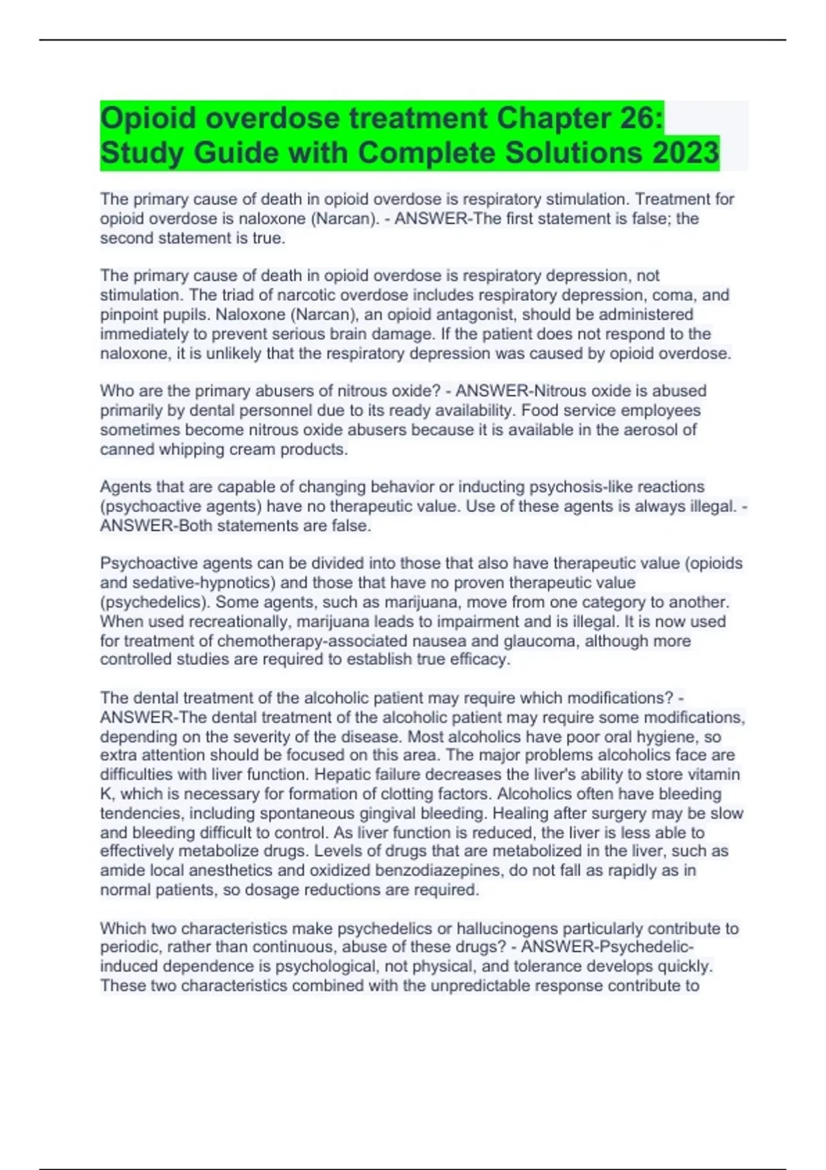 Opioid overdose treatment Chapter 26: Study Guide with Complete Solutions 2023