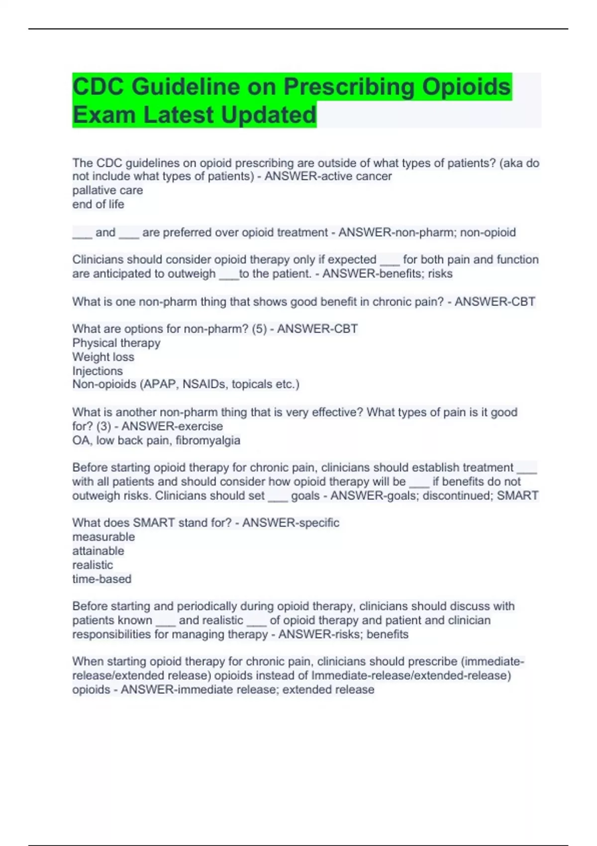 The CDC guidelines on opioid prescribing are outside of what types of patients? (aka do not include what types of patients) - ANSWER-active cancer pallative care end of life ___ and ___ are preferred over opioid treatment - ANSWER-non-pharm; non-opioid Clinicians should consider opioid therapy only if expected ___ for both pain and function are anticipated to outweigh ___to the patient. - ANSWER-benefits; risks What is one non-pharm thing that shows good benefit in chronic pain? - ANSWER-CBT What are options for non-pharm? (5) - ANSWER-CBT Physical therapy Weight loss Injections Non-opioids (APAP, NSAIDs, topicals etc.) What is another non-pharm thing that is very effective? What types of pain is it good for? (3) - ANSWER-exercise OA, low back pain, fibromyalgia Before starting opioid therapy for chronic pain, clinicians should establish treatment ___ with all patients and should consider how opioid therapy will be ___ if benefits do not outweigh risks. Clinicians should set ___ goals - ANSWER-goals; discontinued; SMART What does SMART stand for? - ANSWER-specific measurable attainable realistic time-based Before starting and periodically during opioid therapy, clinicians should discuss with patients known ___ and realistic ___ of opioid therapy and patient and clinician responsibilities for managing therapy - ANSWER-risks; benefits When starting opioid therapy for chronic pain, clinicians should prescribe (immediate-release/extended release) opioids instead of Immediate-release/extended-release) opioids - ANSWER-immediate release; extended release