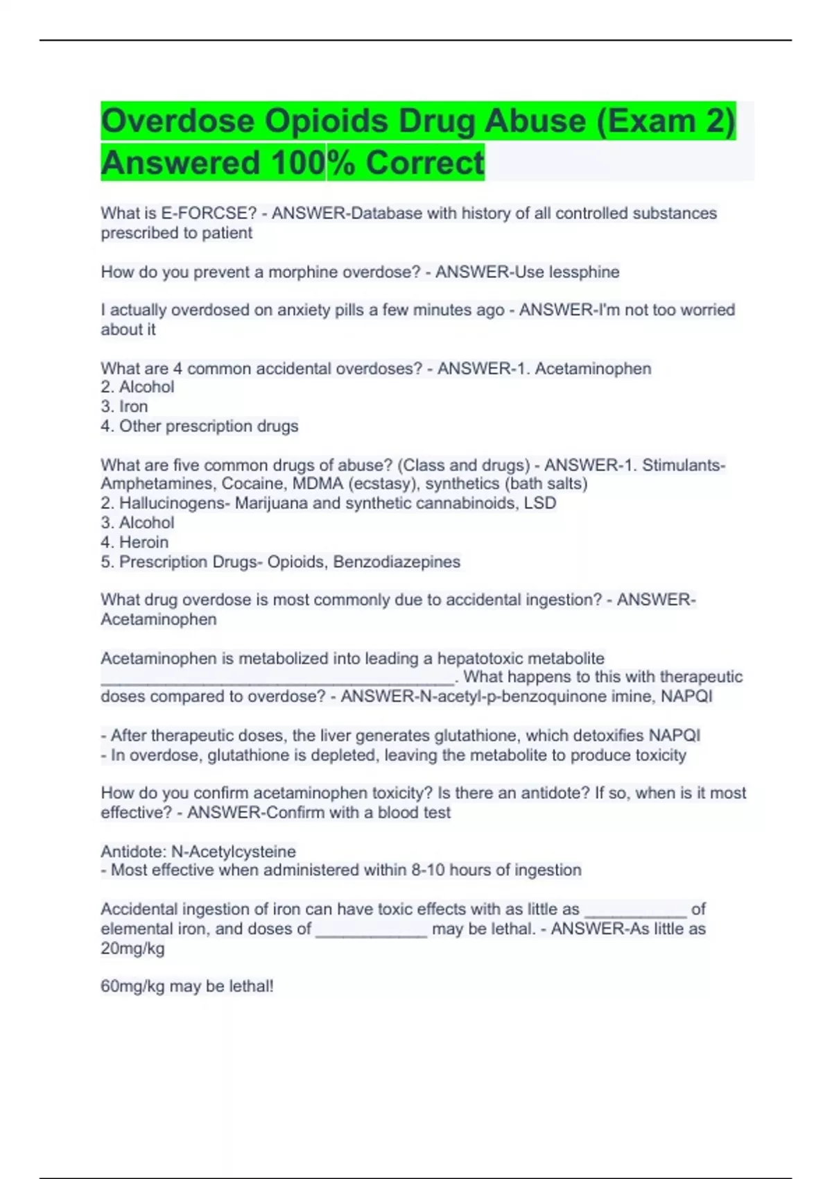 What is E-FORCSE? - ANSWER-Database with history of all controlled substances prescribed to patient How do you prevent a morphine overdose? - ANSWER-Use lessphine I actually overdosed on anxiety pills a few minutes ago - ANSWER-I'm not too worried about it What are 4 common accidental overdoses? - ANSWER-1. Acetaminophen 2. Alcohol 3. Iron 4. Other prescription drugs What are five common drugs of abuse? (Class and drugs) - ANSWER-1. Stimulants- Amphetamines, Cocaine, MDMA (ecstasy), synthetics (bath salts) 2. Hallucinogens- Marijuana and synthetic cannabinoids, LSD 3. Alcohol 4. Heroin 5. Prescription Drugs- Opioids, Benzodiazepines What drug overdose is most commonly due to accidental ingestion? - ANSWER-Acetaminophen Acetaminophen is metabolized into leading a hepatotoxic metabolite ______________________________________. What happens to this with therapeutic doses compared to overdose? - ANSWER-N-acetyl-p-benzoquinone imine, NAPQI - After therapeutic doses, the liver generates glutathione, which detoxifies NAPQI - In overdose, glutathione is depleted, leaving the metabolite to produce toxicity How do you confirm acetaminophen toxicity? Is there an antidote? If so, when is it most effective? - ANSWER-Confirm with a blood test Antidote: N-Acetylcysteine - Most effective when administered within 8-10 hours of ingestion Accidental ingestion of iron can have toxic effects with as little as ___________ of elemental iron, and doses of ____________ may be lethal. - ANSWER-As little as 20mg/kg 60mg/kg may be lethal!