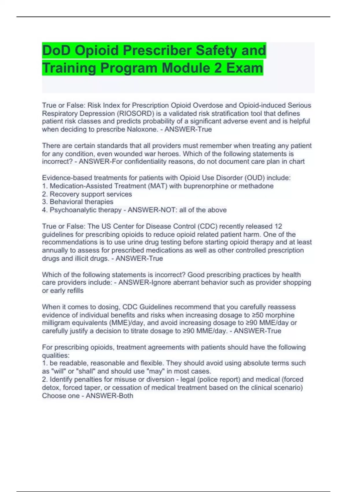 True or False: Risk Index for Prescription Opioid Overdose and Opioid-induced Serious Respiratory Depression (RIOSORD) is a validated risk stratification tool that defines patient risk classes and predicts probability of a significant adverse event and is helpful when deciding to prescribe Naloxone. - ANSWER-True There are certain standards that all providers must remember when treating any patient for any condition, even wounded war heroes. Which of the following statements is incorrect? - ANSWER-For confidentiality reasons, do not document care plan in chart Evidence-based treatments for patients with Opioid Use Disorder (OUD) include: 1. Medication-Assisted Treatment (MAT) with buprenorphine or methadone 2. Recovery support services 3. Behavioral therapies 4. Psychoanalytic therapy - ANSWER-NOT: all of the above True or False: The US Center for Disease Control (CDC) recently released 12 guidelines for prescribing opioids to reduce opioid related patient harm. One of the recommendations is to use urine drug testing before starting opioid therapy and at least annually to assess for prescribed medications as well as other controlled prescription drugs and illicit drugs. - ANSWER-True Which of the following statements is incorrect? Good prescribing practices by health care providers include: - ANSWER-Ignore aberrant behavior such as provider shopping or early refills When it comes to dosing, CDC Guidelines recommend that you carefully reassess evidence of individual benefits and risks when increasing dosage to ≥50 morphine milligram equivalents (MME)/day, and avoid increasing dosage to ≥90 MME/day or carefully justify a decision to titrate dosage to ≥90 MME/day. - ANSWER-True For prescribing opioids, treatment agreements with patients should have the following qualities: 1. be readable, reasonable and flexible. They should avoid using absolute terms such as "will" or "shall" and should use "may" in most cases. 2. Identify penalties for misuse or diversion - legal (police report) and medical (forced detox, forced taper, or cessation of medical treatment based on the clinical scenario) Choose one - ANSWER-Both