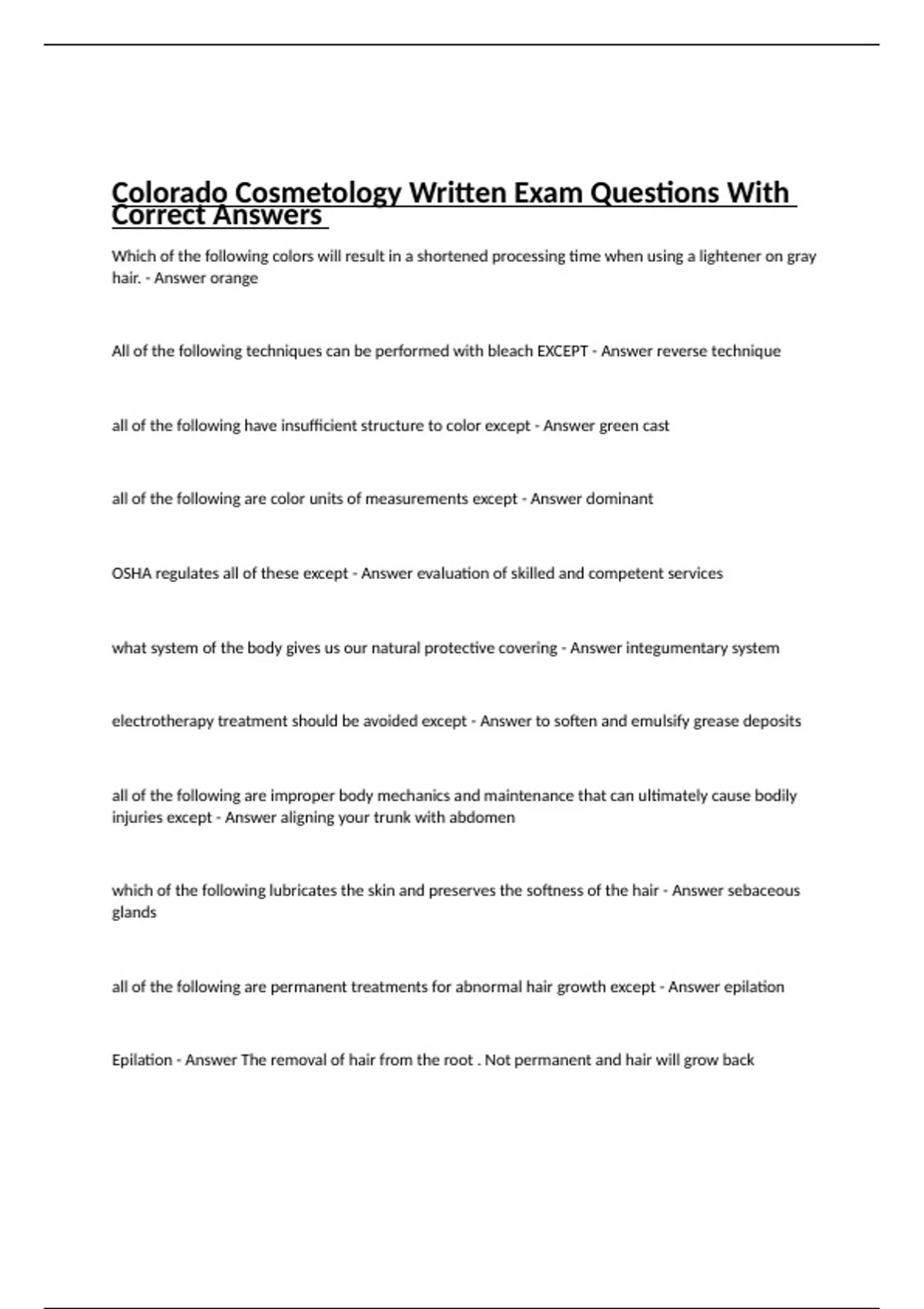 Colorado Cosmetology Written Exam Questions With Correct Answers