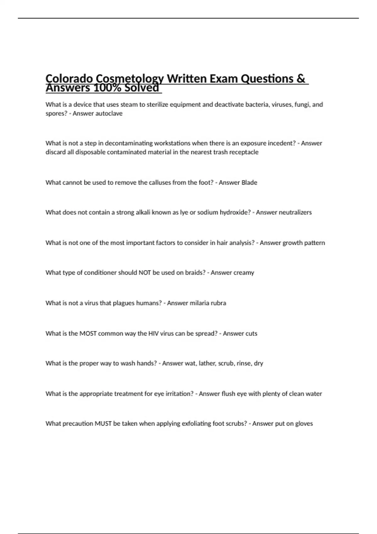 Colorado Cosmetology Written Exam Questions & Answers 100% Solved