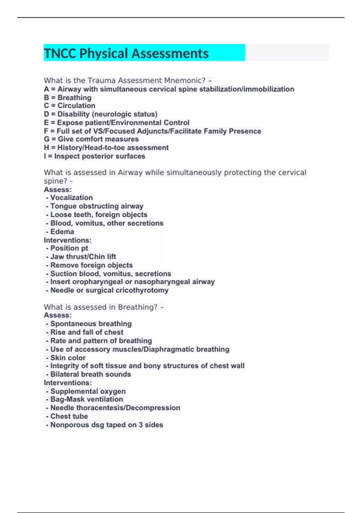 TNCC Physical Assessments Questions and Answers 2022/2023