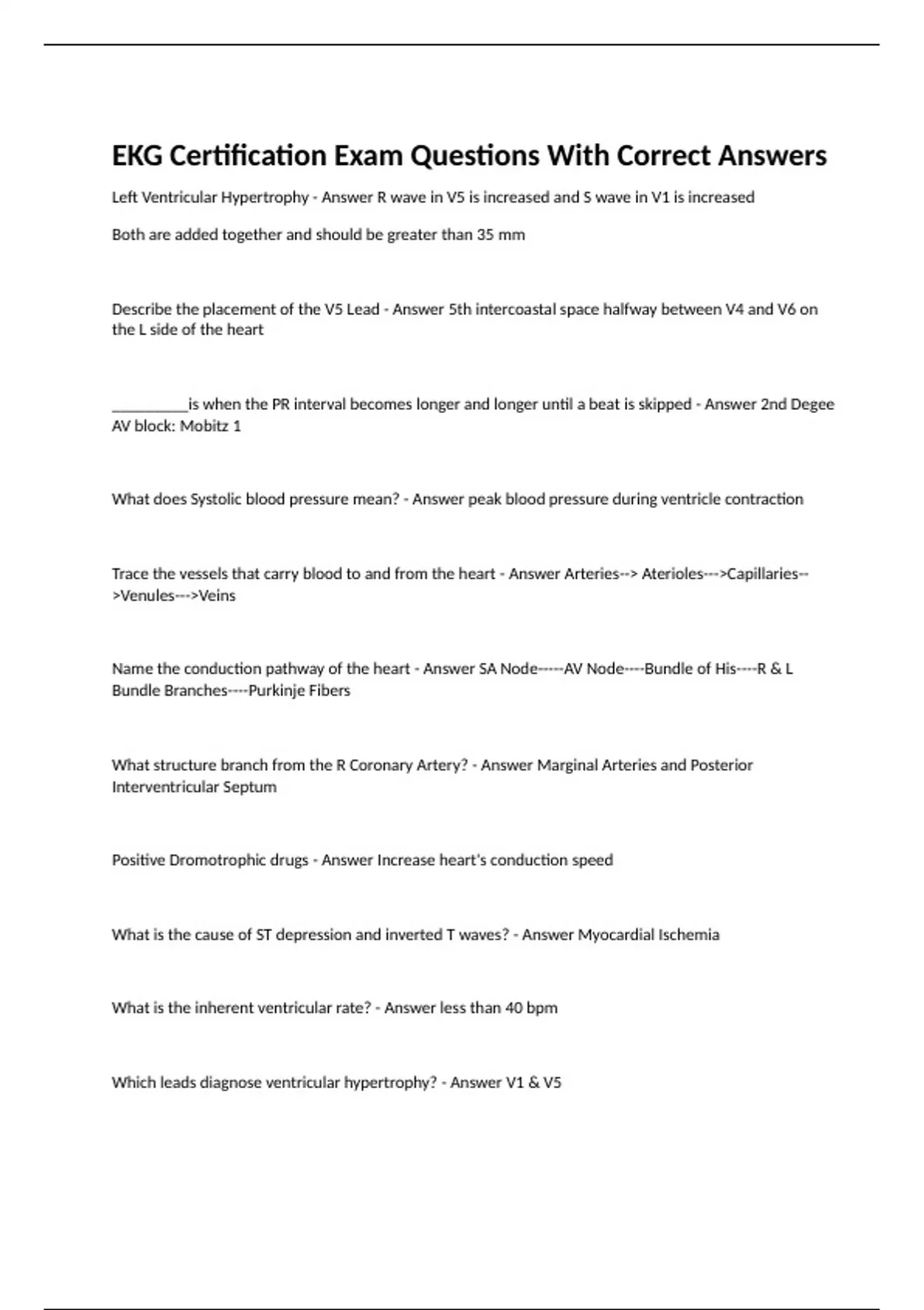 Left Ventricular Hypertrophy - Answer R wave in V5 is increased and S wave in V1 is increased Both are added together and should be greater than 35 mm Describe the placement of the V5 Lead - Answer 5th intercoastal space halfway between V4 and V6 on the L side of the heart _________is when the PR interval becomes longer and longer until a beat is skipped - Answer 2nd Degee AV block: Mobitz 1 What does Systolic blood pressure mean? - Answer peak blood pressure during ventricle contraction Trace the vessels that carry blood to and from the heart - Answer Arteries--> Aterioles--->Capillaries-->Venules--->Veins Name the conduction pathway of the heart - Answer SA Node-----AV Node----Bundle of His----R & L Bundle Branches----Purkinje Fibers What structure branch from the R Coronary Artery? - Answer Marginal Arteries and Posterior Interventricular Septum Positive Dromotrophic drugs - Answer Increase heart's conduction speed What is the cause of ST depression and inverted T waves? - Answer Myocardial Ischemia What is the inherent ventricular rate? - Answer less than 40 bpm Which leads diagnose ventricular hypertrophy? - Answer V1 & V5 Negative chronotropic drugs - Answer Decrease HR Describe the placement of V6 - Answer Left side of the heart on 5th intercoastal space on the mid axillary line Positive QRS in LI and positive QRS in AVF is what kind of deviation? - Answer Normal Name the major arteries that branch of the aorta - Answer Subclavian, Cartoid, Brachiocephalic Describe the placement of V2 - Answer 4th Intercoastal space on the left side of the heart Blood leaving the LV flows through the _________into the systemic circulation. - Answer Aortic Semi Lunar Valve What do the semilunar valves prevent? - Answer backflow of the blood from the aorta into the LV Describe placement of the V4 - Answer Left side of the sternum on the 5th Intercoastal space on the mid clavicular line The normal height of the P wave should be - Answer 3small squares high x less than 3 small squqares Where is the PR interval measured? - Answer Beginning of the P wave to the beginning of the Q wave What type of resistance to blood flow primarily is caused by friction within the vessel walls? - Answer Peripheral resistance What is the oxygen saturation of the LAtrium? - Answer 95% Movement of an impulse to positive electrode causes a ______________deflection. - Answer Upward Where is the Mitral Valve located? - Answer In between the Left Atrium and Left Ventricle What are the characteristics of "Wandering Pacemaker"? - Answer P waves have all different shapes What do spiked T waves indicate? - Answer Hyperkalemia What does the T wave represent? - Answer Ventricular replorization What is the first upward deflection on the ECG? What does it represent? - Answer 1. P wave 2. Atrial deplorization What is the standard ECG paper speed? - Answer 25 mm/sec What is the rate for tachycardia? - Answer HR that is greater than 100 but less than 250 bpm Name the Three deflections in the QRS - Answer Q=downward R=Upward S=downward What is the oxygen saturation of the Right Atria? - Answer 75% What does MCL stand for? - Answer Modified Chest Lead Positive chronotropic drugs___________ HR. - Answer Increase