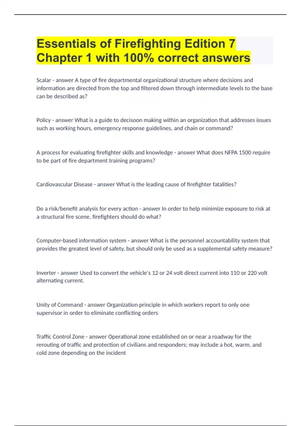 Scalar A type of fire departmental organizational structure where decisions and information are directed from the top and filtered down through intermediate levels to the base can be described as? Policy What is a guide to decisoon making within an organization that addresses issues such as working hours, emergency response guidelines, and chain or command? A process for evaluating firefighter skills and knowledge What does NFPA 1500 require to be part of fire department training programs? Cardiovascular Disease What is the leading cause of firefighter fatalities? Do a risk/benefit analysis for every action In order to help minimize exposure to risk at a structural fire scene, firefighters should do what? Computer-based information system What is the personnel accountability system that provides the greatest level of safety, but should only be used as a supplemental safety measure? Inverter Used to convert the vehicle's 12 or 24 volt direct current into 110 or 220 volt alternating current. Unity of Command Organization principle in which workers report to only one supervisor in order to eliminate conflicting orders Traffic Control Zone Operational zone established on or near a roadway for the rerouting of traffic and protection of civilians and responders; may include a hot, warm, and cold zone depending on the incident SOP Standard Operating Procedures Formal methods or rules to guide the performance or routine functions or emergency operations. Procedures are typically written in a handbook, so that all firefighters can consult and become familiar with them Standard A set of principals, protocols, or procedures that explain how to do something or provide a set of minimum standards to be followedy span of control the optimal number of subordinates a manager supervises or should supervise. (3-7) 5 being optimum Risk-Managment Plan Written plan that identifies and analyzes the exposure to hazards, selects appropriate risk management techniques to handle exposures, implements those techniques, and monitor the results Procedure Outline of steps that must be performed in order to properly follow and organizational policy Policy Organizational principle that is developed and adopted as a basis for decision making Personnel accountability system A method of tracking the identity, assignment, and location of fire fighters operating at an incident scene. Incident Commander Person in charge of the incident command system and responsible for the management of all incident operations during an emergency Incident Command System Standardized approach to incident management that facilitates interaction between cooperating agencies; adaptable to incidents of any size or type.