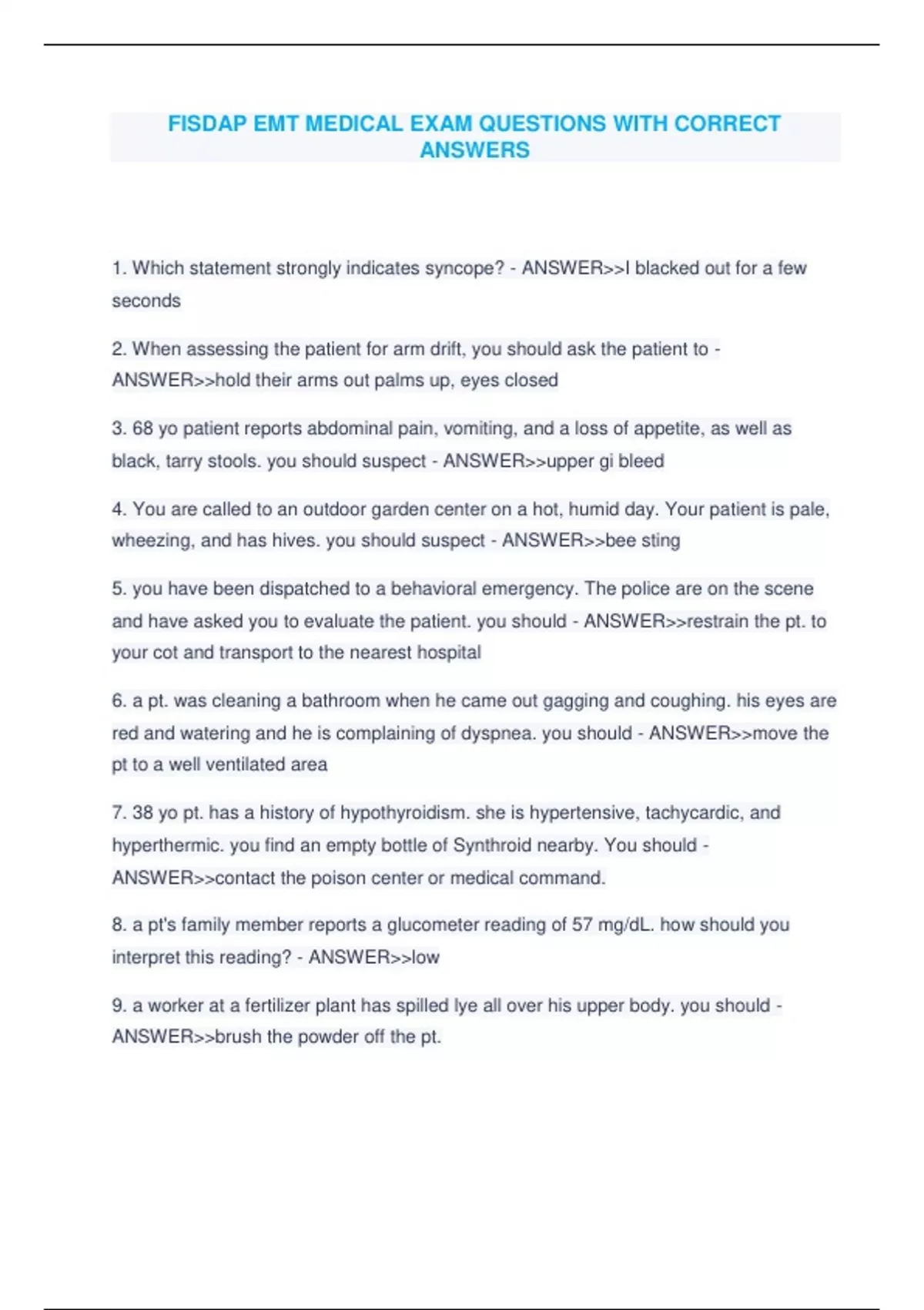 FISDAP EMT MEDICAL EXAM QUESTIONS WITH CORRECT ANSWERS