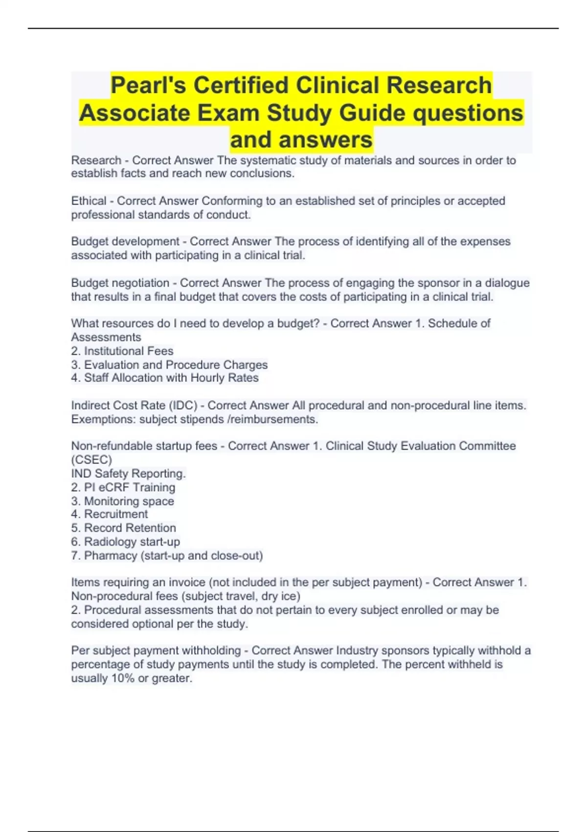 Pearl's Certified Clinical Research Associate Exam Study Guide questions with complete solutions