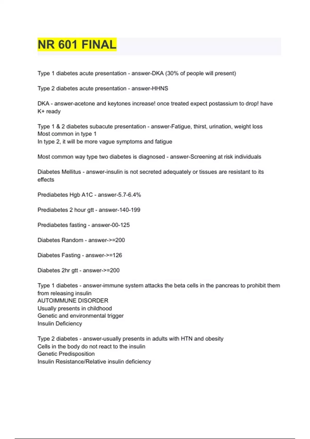 NR 601 FINAL 2023 verified questions and answer exams with full solution ype 1 diabetes acute presentation - answer-DKA (30% of people will present) Type 2 diabetes acute presentation - answer-HHNS DKA - answer-acetone and keytones increase! once treated expect postassium to drop! have K+ ready Type 1 & 2 diabetes subacute presentation - answer-Fatigue, thirst, urination, weight loss Most common in type 1 In type 2, it will be more vague symptoms and fatigue
