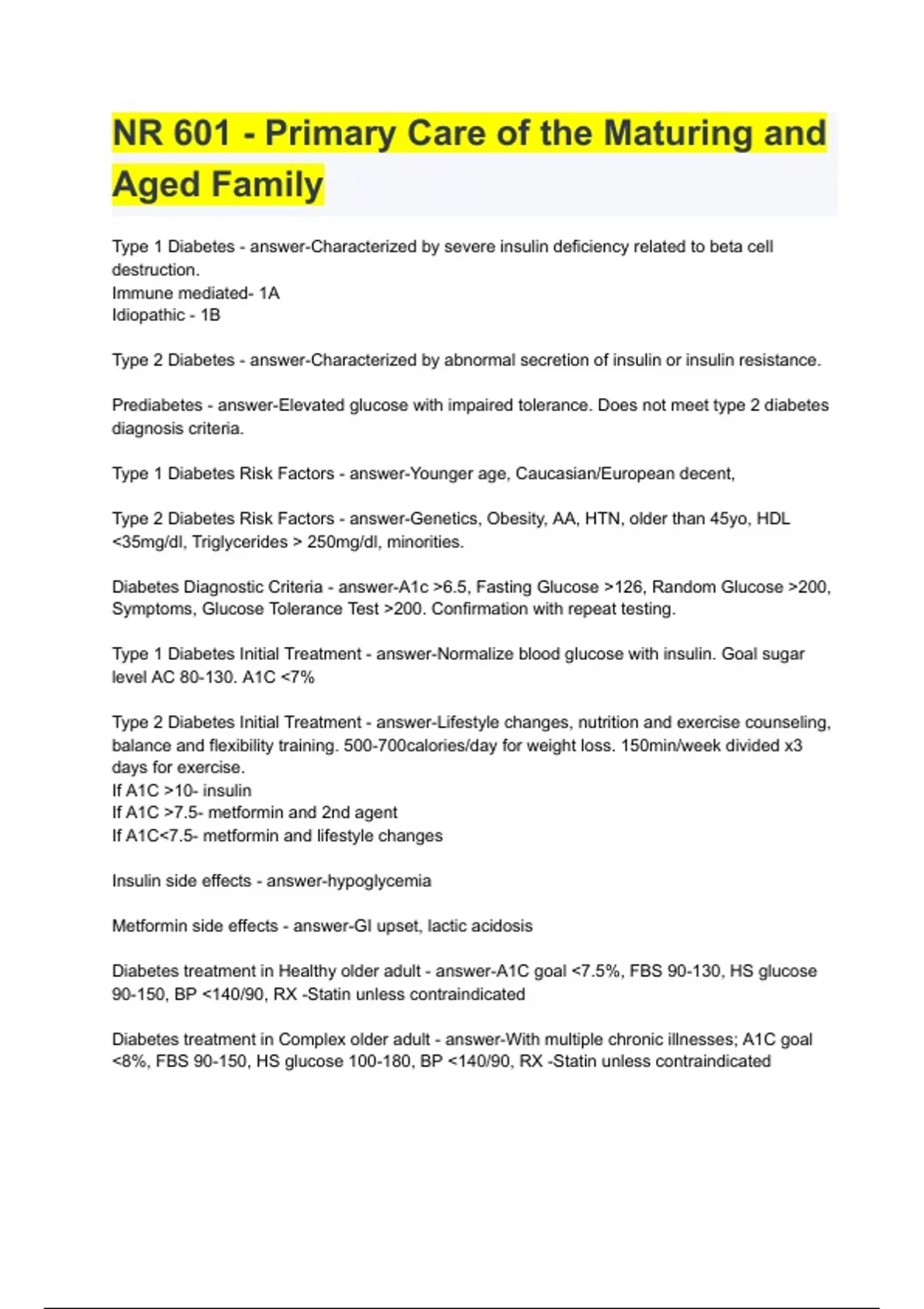 2023 NR 601 - Primary Care of the Maturing and Aged Family with full solution Type 1 Diabetes - answer-Characterized by severe insulin deficiency related to beta cell destruction. Immune mediated- 1A Idiopathic - 1B Type 2 Diabetes - answer-Characterized by abnormal secretion of insulin or insulin resistance. Prediabetes - answer-Elevated glucose with impaired tolerance. Does not meet type 2 diabetes diagnosis criteria.