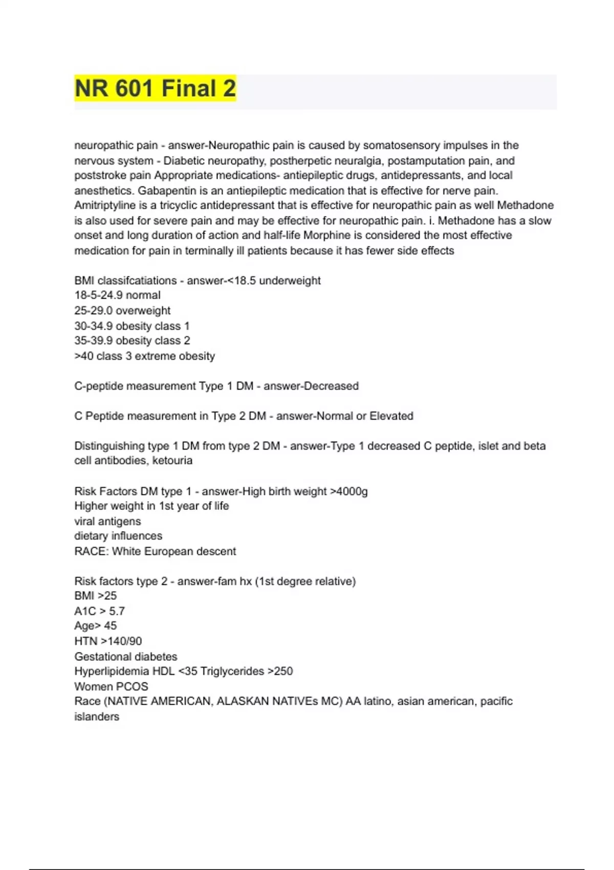 2023 NR 601 Final 2 verified correct answers 100% with full solution neuropathic pain - answer-Neuropathic pain is caused by somatosensory impulses in the nervous system - Diabetic neuropathy, postherpetic neuralgia, postamputation pain, and poststroke pain Appropriate medications- antiepileptic drugs, antidepressants, and local anesthetics. Gabapentin is an antiepileptic medication that is effective for nerve pain. Amitriptyline is a tricyclic antidepressant that is effective for neuropathic pain as well Methadone is also used for severe pain and may be effective for neuropathic pain. i. Methadone has a slow onset and long duration of action and half-life Morphine is considered the most effective medication for pain in terminally ill patients because it has fewer side effects BMI classifcatiations - answer-<18.5 underweight 18-5-24.9 normal 25-29.0 overweight 30-34.9 obesity class 1 35-39.9 obesity class 2