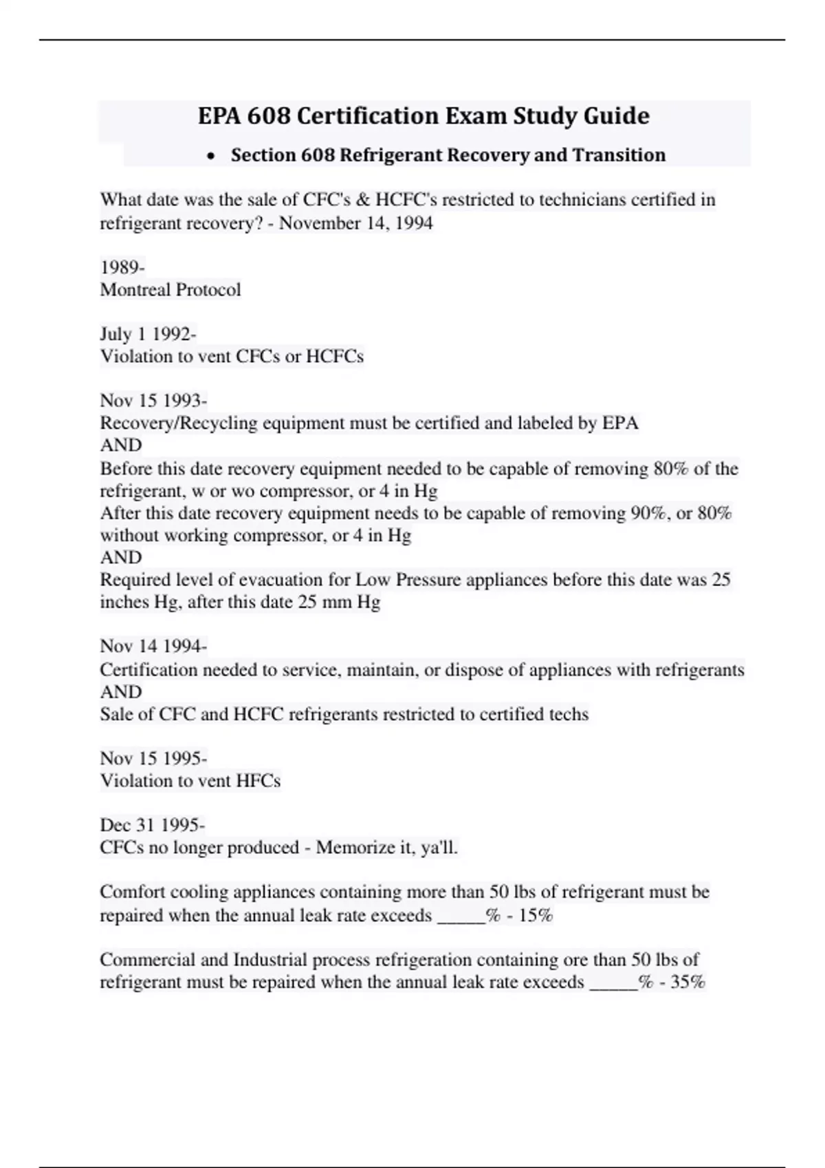 EPA 608 Certification Exam Study Guide • Section 608 Refrigerant Recovery and Transition