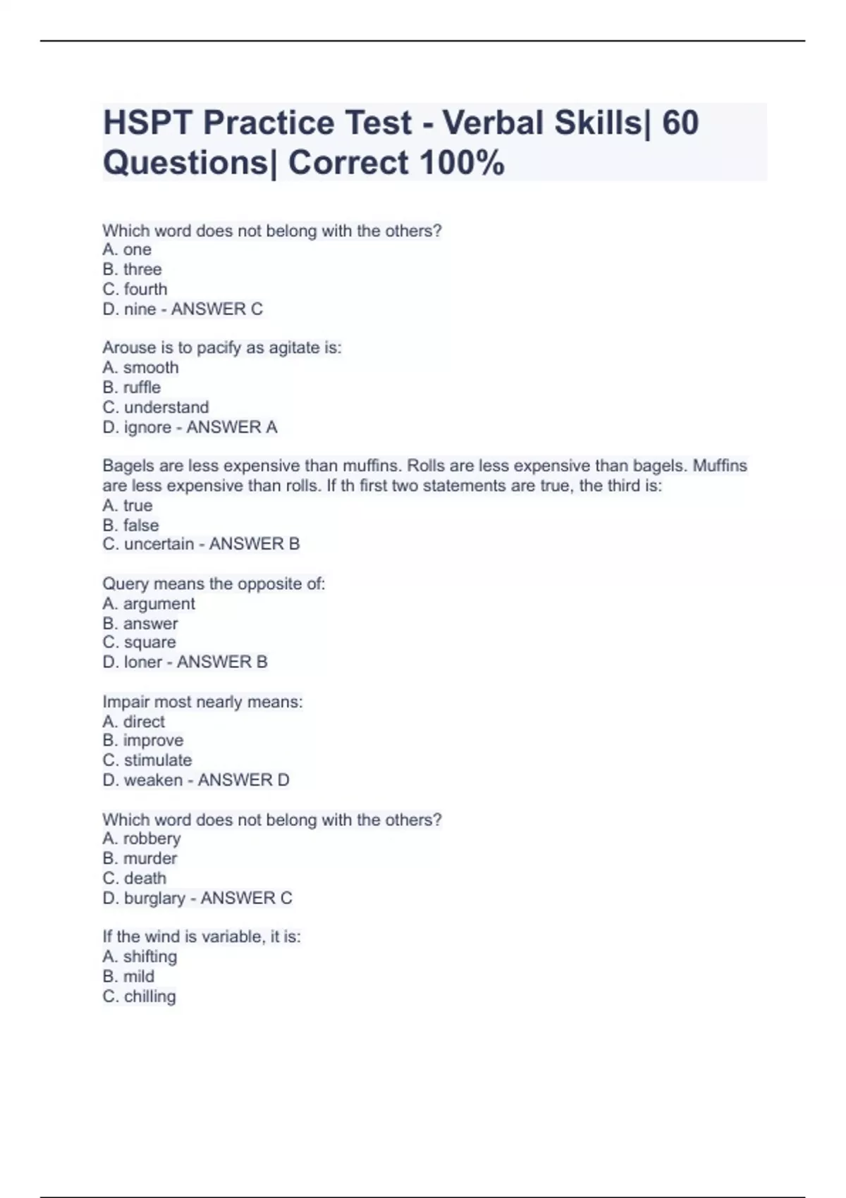 Which word does not belong with the others? A. one B. three C. fourth D. nine - ANSWER C Arouse is to pacify as agitate is: A. smooth B. ruffle C. understand D. ignore - ANSWER A Bagels are less expensive than muffins. Rolls are less expensive than bagels. Muffins are less expensive than rolls. If th first two statements are true, the third is: A. true B. false C. uncertain - ANSWER B Query means the opposite of: A. argument B. answer C. square D. loner - ANSWER B Impair most nearly means: A. direct B. improve C. stimulate D. weaken - ANSWER D Which word does not belong with the others? A. robbery B. murder C. death D. burglary - ANSWER C If the wind is variable, it is: A. shifting B. mild C. chilling