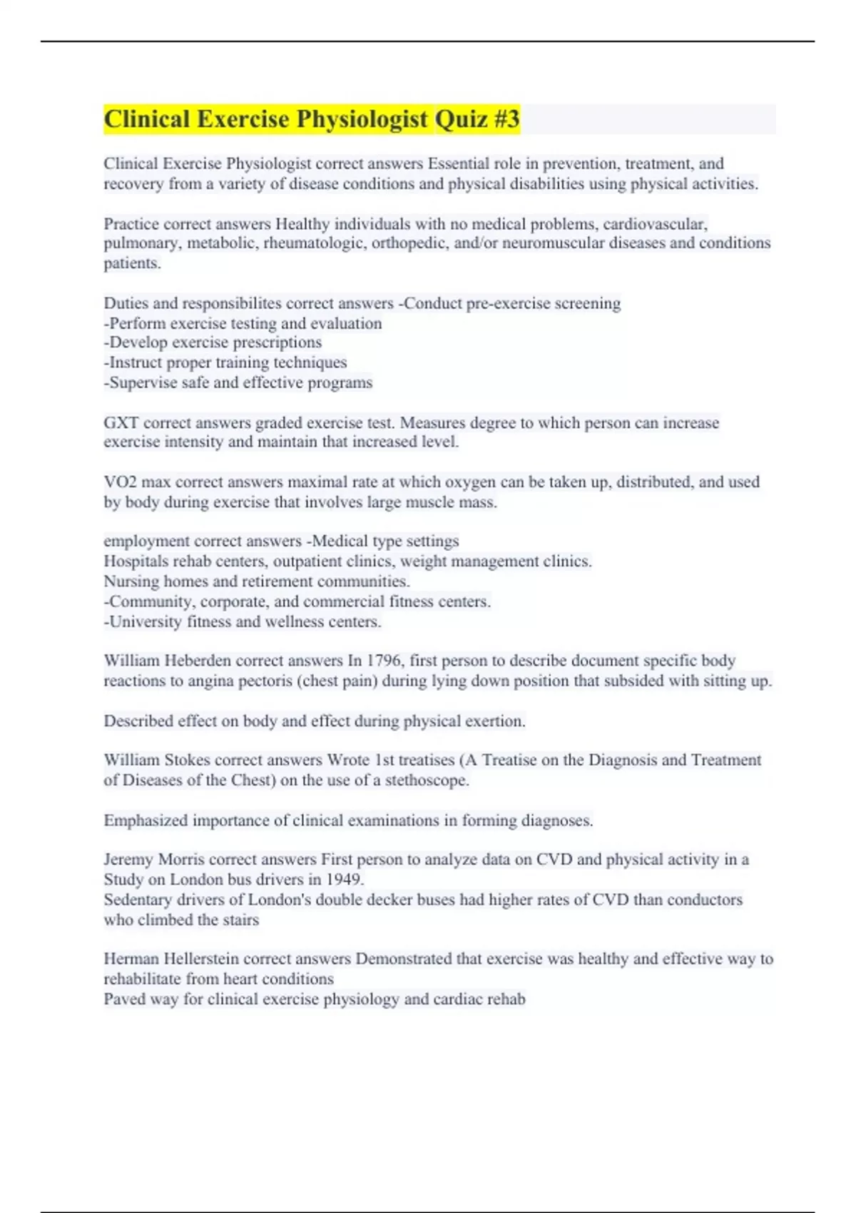 Clinical Exercise Physiologist correct answers Essential role in prevention, treatment, and recovery from a variety of disease conditions and physical disabilities using physical activities. Practice correct answers Healthy individuals with no medical problems, cardiovascular, pulmonary, metabolic, rheumatologic, orthopedic, and/or neuromuscular diseases and conditions patients. Duties and responsibilites correct answers -Conduct pre-exercise screening -Perform exercise testing and evaluation -Develop exercise prescriptions -Instruct proper training techniques -Supervise safe and effective programs GXT correct answers graded exercise test. Measures degree to which person can increase exercise intensity and maintain that increased level. VO2 max correct answers maximal rate at which oxygen can be taken up, distributed, and used by body during exercise that involves large muscle mass. employment correct answers -Medical type settings Hospitals rehab centers, outpatient clinics, weight management clinics. Nursing homes and retirement communities. -Community, corporate, and commercial fitness centers. -University fitness and wellness centers. William Heberden correct answers In 1796, first person to describe document specific body reactions to angina pectoris (chest pain) during lying down position that subsided with sitting up. Described effect on body and effect during physical exertion. William Stokes correct answers Wrote 1st treatises (A Treatise on the Diagnosis and Treatment of Diseases of the Chest) on the use of a stethoscope. Emphasized importance of clinical examinations in forming diagnoses. Jeremy Morris correct answers First person to analyze data on CVD and physical activity in a Study on London bus drivers in 1949. Sedentary drivers of London's double decker buses had higher rates of CVD than conductors who climbed the stairs Herman Hellerstein correct answers Demonstrated that exercise was healthy and effective way to rehabilitate from heart conditions Paved way for clinical exercise physiology and cardiac rehab