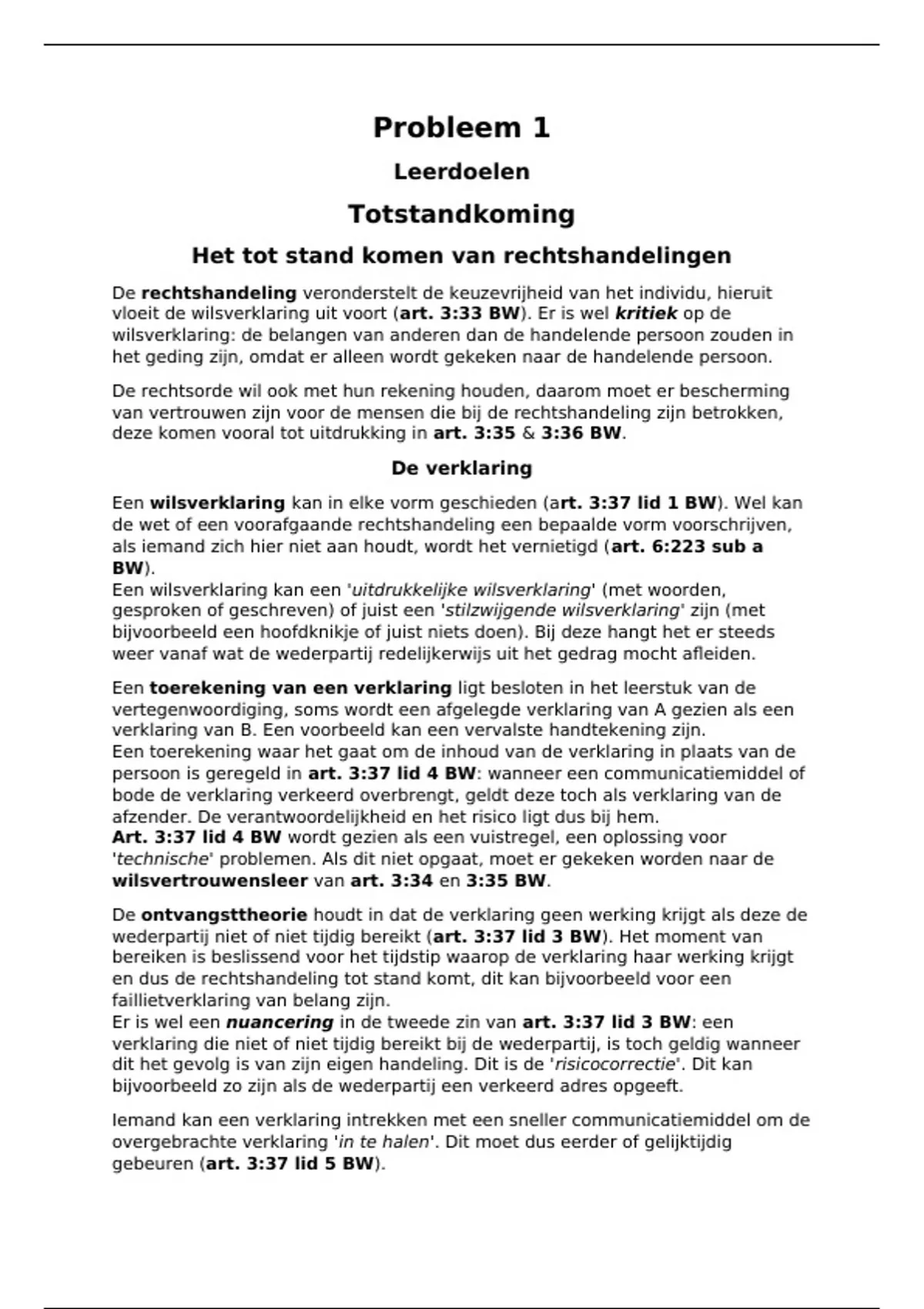 Uitwerkingen van probleem 1, waarbij het gaat om de totstandkoming van rechtshandelingen en overeenkomsten. Ook gaat het over vertegenwoordiging en volmacht.