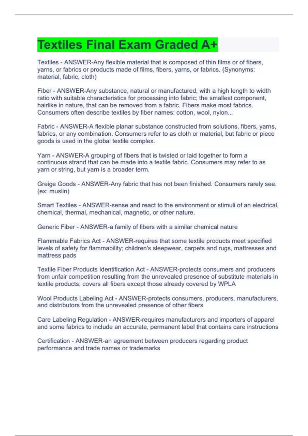 Textiles - ANSWER-Any flexible material that is composed of thin films or of fibers, yarns, or fabrics or products made of films, fibers, yarns, or fabrics. (Synonyms: material, fabric, cloth) Fiber - ANSWER-Any substance, natural or manufactured, with a high length to width ratio with suitable characteristics for processing into fabric; the smallest component, hairlike in nature, that can be removed from a fabric. Fibers make most fabrics. Consumers often describe textiles by fiber names: cotton, wool, nylon... Fabric - ANSWER-A flexible planar substance constructed from solutions, fibers, yarns, fabrics, or any combination. Consumers refer to as cloth or material, but fabric or piece goods is used in the global textile complex. Yarn - ANSWER-A grouping of fibers that is twisted or laid together to form a continuous strand that can be made into a textile fabric. Consumers may refer to as yarn or string, but yarn is a broader term. Greige Goods - ANSWER-Any fabric that has not been finished. Consumers rarely see. (ex: muslin) Smart Textiles - ANSWER-sense and react to the environment or stimuli of an electrical, chemical, thermal, mechanical, magnetic, or other nature. Generic Fiber - ANSWER-a family of fibers with a similar chemical nature Flammable Fabrics Act - ANSWER-requires that some textile products meet specified levels of safety for flammability; children's sleepwear, carpets and rugs, mattresses and mattress pads Textile Fiber Products Identification Act - ANSWER-protects consumers and producers from unfair competition resulting from the unrevealed presence of substitute materials in textile products; covers all fibers except those already covered by WPLA Wool Products Labeling Act - ANSWER-protects consumers, producers, manufacturers, and distributors from the unrevealed presence of other fibers Care Labeling Regulation - ANSWER-requires manufacturers and importers of apparel and some fabrics to include an accurate, permanent label that contains care instructions Certification - ANSWER-an agreement between producers regarding product performance and trade names or trademarks Licensing - ANSWER-allows one business to legally use the trademark and expertise of another businessto make, use, or sell a product in a specific geographic area Trademark Names - ANSWER-name a manufacturer uses to identify goods it sells or makes; not just used with fibers, but finishes, yarns and fabrics; trademark names begin with uppercase letters; registered by the manufacturer Trade Name - ANSWER-a word that distinguishes one textile from another textile and often includes quality-control programs Sustainability - ANSWER-practices and policies that reduce environmental pollution and do not exploit people or natural resources in meeting the lifestyle needs of the present without compromising the future Denier - ANSWER-the weight in grams of 9000 meters of fiber or yarn (small=fine, large=course) Life Cycle Assessment - ANSWER-examines the way the production, use, care, and disposal of a product affects the environment and the people Staple Fibers - ANSWER-short fibers measured in inches or centimeters (2 to 46 cm); except for silk, natural fibers are only staple length Filament Fibers - ANSWER-long fibers measured in kilometers (monofilament or multifilament) Tow - ANSWER-short flax fibers Fiber Crimp - ANSWER-the waves, bends, twists, coils, or curls along a fiber Cover - ANSWER-the ability of a fiber to conceal or protect Luster - ANSWER-the brightness or shininess of a fiber; describes the way light is reflected (shiny/bright vs dull/matte) Drape - ANSWER-the way a fabric falls over a 3-D form like a body or table Hand - ANSWER-the way a textile fabric feels next to the skin Texture - ANSWER-the nature of a textile surface; includes visual and tactile perspective (smooth vs rough) Abrasion Resistance - ANSWER-the ability of a textile to withstand the rubbing it gets during use Flexibility - ANSWER-the ability to bend repeatedly without breaking