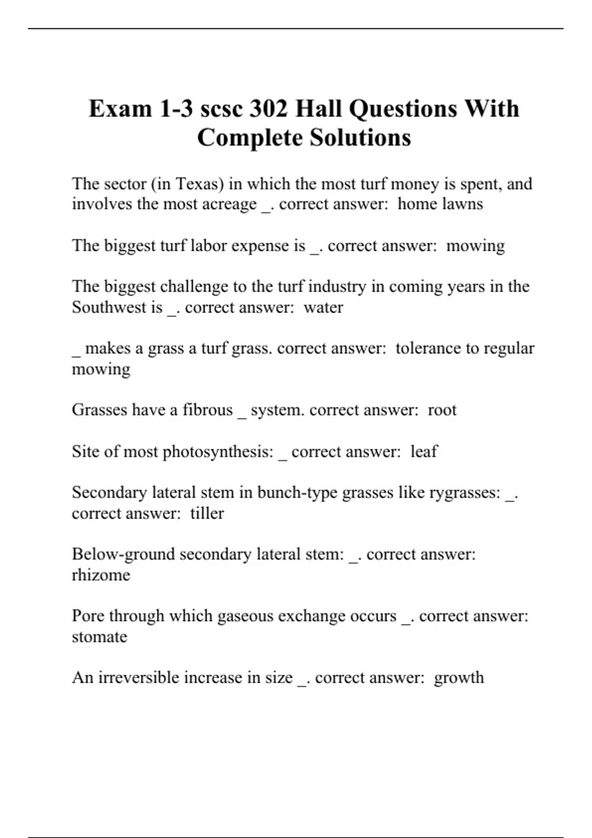 The sector (in Texas) in which the most turf money is spent, and involves the most acreage _. correct answer: home lawns The biggest turf labor expense is _. correct answer: mowing The biggest challenge to the turf industry in coming years in the Southwest is _. correct answer: water _ makes a grass a turf grass. correct answer: tolerance to regular mowing Grasses have a fibrous _ system. correct answer: root Site of most photosynthesis: _ correct answer: leaf Secondary lateral stem in bunch-type grasses like rygrasses: _. correct answer: tiller Below-ground secondary lateral stem: _. correct answer: rhizome Pore through which gaseous exchange occurs _. correct answer: stomate An irreversible increase in size _. correct answer: growth Breaking down of carbohydrates to produce energy _. correct answer: respiration A change in form, as from vegetative to reproductive _. correct answer: development The production of carbohydrates from CO2 and water in the presence of light _. correct answer: photosynthesis The major storage site for carbohydrates in turfgrasses _. correct answer: lateral stems What type of turf grass would be best suited for a football field for an NFL team in San Antonio? correct answer: Tifway Bermuda What type of turf grass would be best suited for a shady lawn in Houston that tends to get mowed with a dull blade? correct answer: St. Augustinegrass What type of turf grass would be best suited for a practice football field on a small budget? correct answer: Common bermuda What type of turf grass would be best suited a golf course putting green in Missouri? correct answer: Bentgrass What type of turf grass would be best suited for a moderately shady lawn in Houston that will be mowed at half an inch? correct answer: Zoysia What type of turf grass would be best suited for a sunny lawn in southern Georgia (hot+wet) correct answer: Centipedegrass What type of turf grass would be best suited for an irrigated lawn in Dallas? correct answer: tall fescue What type of turf grass would be best suited for a grass used for overseeing golf course fairways and greens in the south? correct answer: Perennial ryegrass What type of turf grass would be best suited for a sunny lawn in Michigan? correct answer: Kentucky bluegrass What type of turf grass would be best suited for a roadside in San Antonio? correct answer: Buffalograss There are differences among St. Augustinegrass cultivars in _. correct answer: shade tolerance, drought tolerance and resistance to SAD What type of turf grass would be best suited for a lawn in South Texas, full sun to light shade, and the neighbors complain about chinch bugs? correct answer: Floratam St. Augustinegrass Traditionally, the St. Augustinegrass cultivar which is most widely sold is: correct answer: Raleigh A layer of non or partially decomposed plant parts just above the soil surface is called _. correct answer: thatch Bermudagrass has _. correct answer: both stolons and rhizomes Which of the following grasses is likely to present mowing difficulties? correct answer: Zoysia Which of the following CANNOT normally be established successfully from seed? correct answer: St. Augustinegrass/Tifwaybermuda The most common hybrid bermudagrass found on sports fields and fairways, it is considered the "industry standard" for warm season sportsturf. correct answer: Tifway Bermuda A major cool season weed in the South, this grass is sometimes managed as a perennial in the North. correct answer: Annual bluegrass The most heat tolerance of the following: creeping bentgrass, zoysia, tall fescue, perennial ryegrass, Kentucky bluegrass. correct answer: Zoysia A low maintenance turf grass that is not used for high quality lawns because of its lack of density and uns