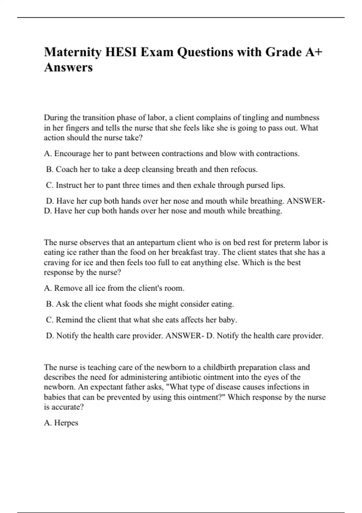 During the transition phase of labor, a client complains of tingling and numbness in her fingers and tells the nurse that she feels like she is going to pass out. What action should the nurse take? A. Encourage her to pant between contractions and blow with contractions. B. Coach her to take a deep cleansing breath and then refocus. C. Instruct her to pant three times and then exhale through pursed lips. D. Have her cup both hands over her nose and mouth while breathing. ANSWER- D. Have her cup both hands over her nose and mouth while breathing. The nurse observes that an antepartum client who is on bed rest for preterm labor is eating ice rather than the food on her breakfast tray. The client states that she has a craving for ice and then feels too full to eat anything else. Which is the best response by the nurse? A. Remove all ice from the client's room. B. Ask the client what foods she might consider eating. C. Remind the client that what she eats affects her baby. D. Notify the health care provider. ANSWER- D. Notify the health care provider. The nurse is teaching care of the newborn to a childbirth preparation class and describes the need for administering antibiotic ointment into the eyes of the newborn. An expectant father asks, "What type of disease causes infections in babies that can be prevented by using this ointment?" Which response by the nurse is accurate? A. Herpes