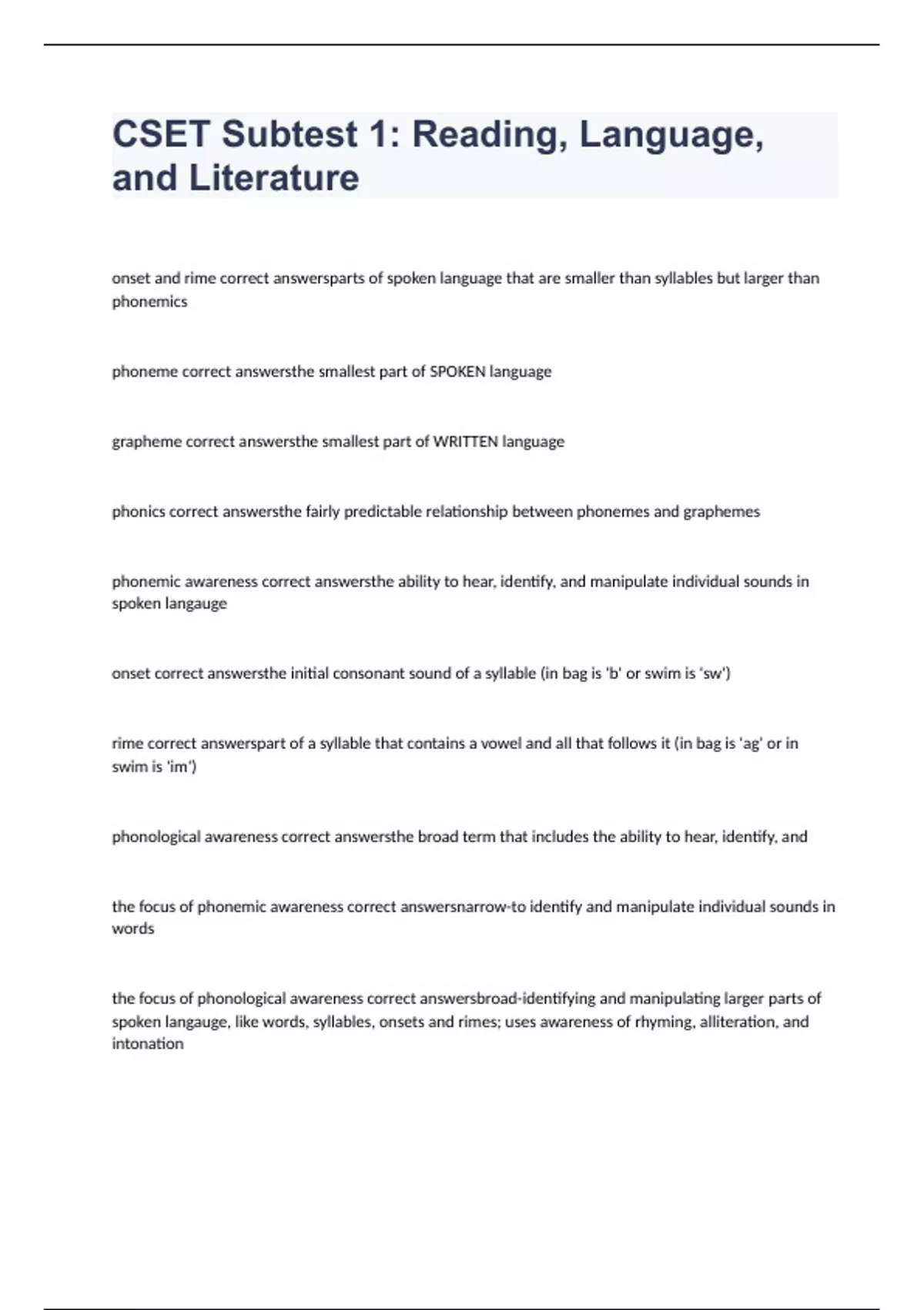 CSET Subtest 1: Reading, Language, and Literature exam 2023 with correct answers