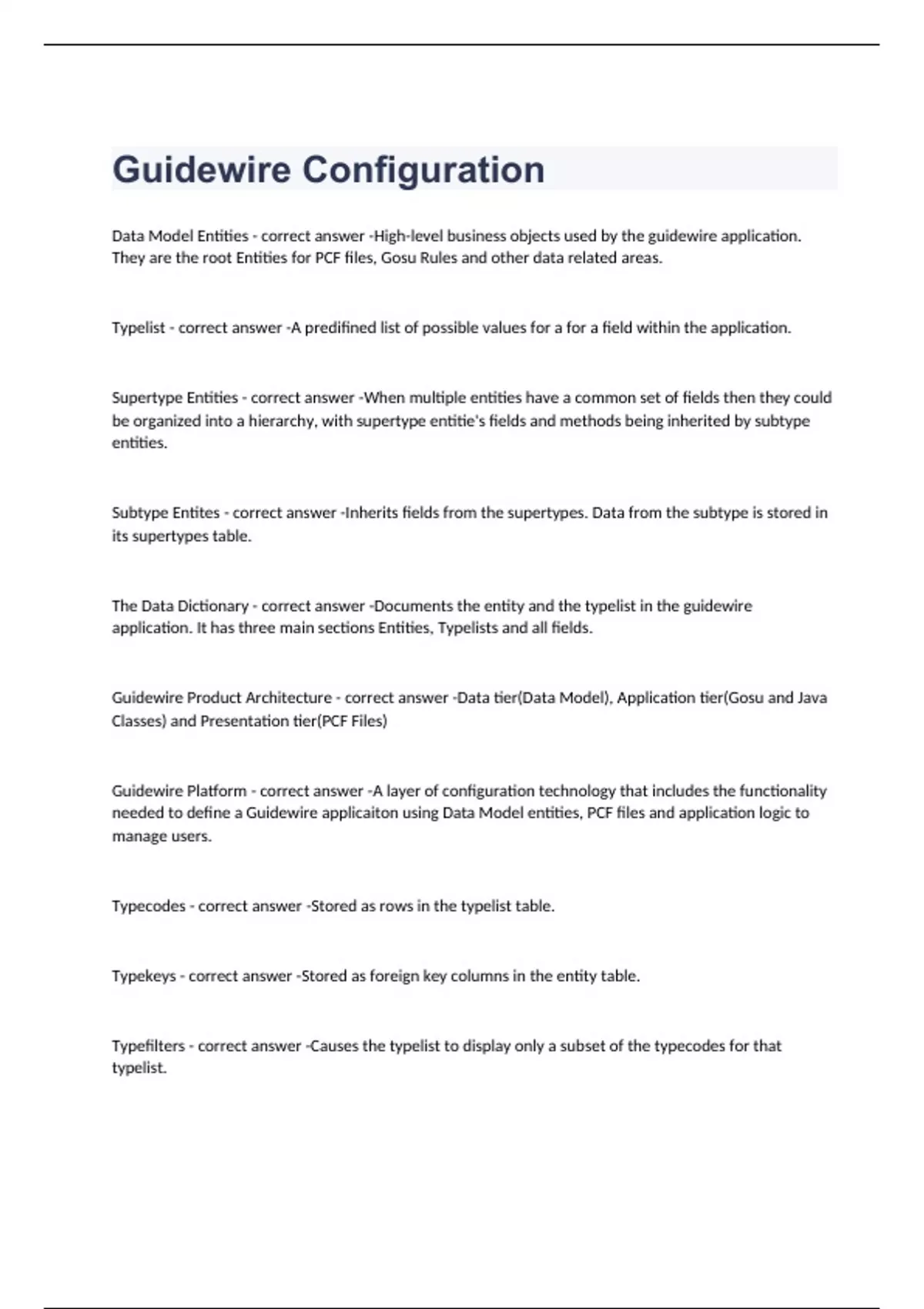 Data Model Entities - correct answer -High-level business objects used by the guidewire application. They are the root Entities for PCF files, Gosu Rules and other data related areas. Typelist - correct answer -A predifined list of possible values for a for a field within the application. Supertype Entities - correct answer -When multiple entities have a common set of fields then they could be organized into a hierarchy, with supertype entitie's fields and methods being inherited by subtype entities. Subtype Entites - correct answer -Inherits fields from the supertypes. Data from the subtype is stored in its supertypes table. The Data Dictionary - correct answer -Documents the entity and the typelist in the guidewire application. It has three main sections Entities, Typelists and all fields. Guidewire Product Architecture - correct answer -Data tier(Data Model), Application tier(Gosu and Java Classes) and Presentation tier(PCF Files) Guidewire Platform - correct answer -A layer of configuration technology that includes the functionality needed to define a Guidewire applicaiton using Data Model entities, PCF files and application logic to manage users. Typecodes - correct answer -Stored as rows in the typelist table. Typekeys - correct answer -Stored as foreign key columns in the entity table. Typefilters - correct answer -Causes the typelist to display only a subset of the typecodes for that typelist. F