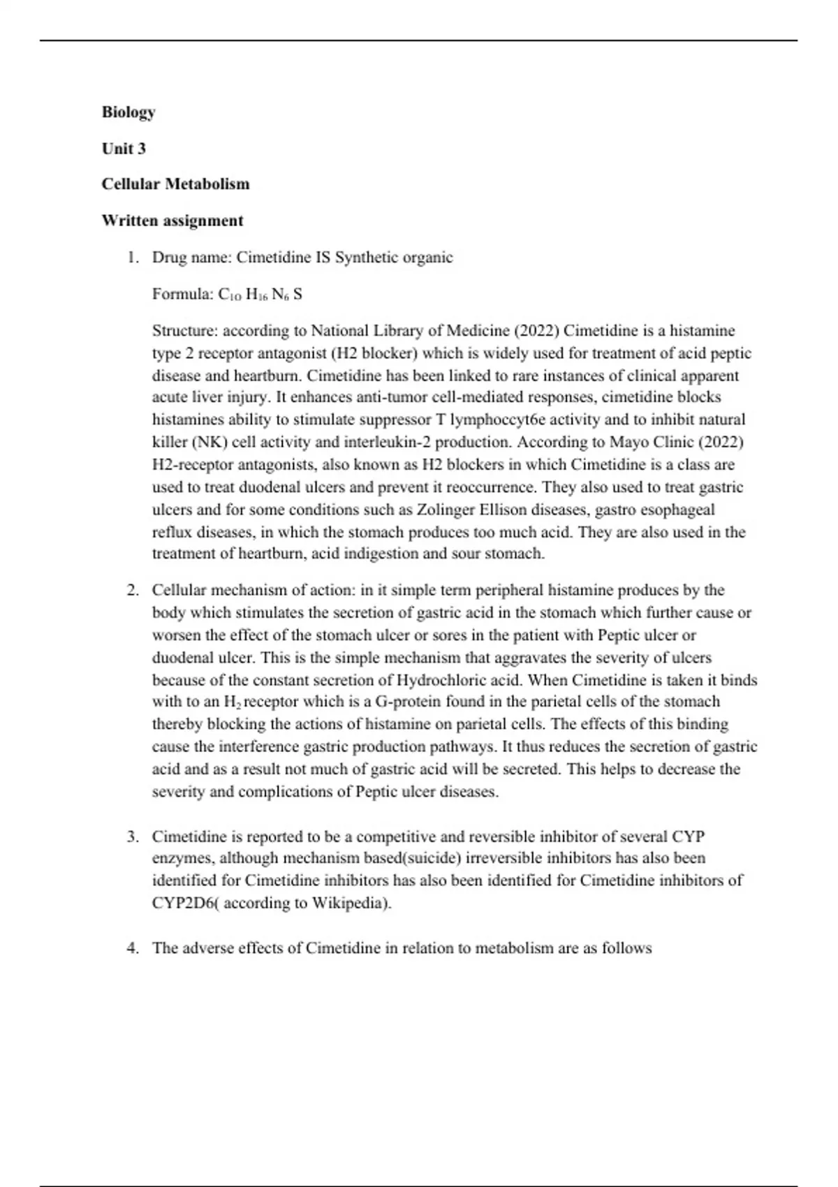 Structure: according to National Library of Medicine (2022) Cimetidine is a histamine type 2 receptor antagonist (H2 blocker) which is widely used for treatment of acid peptic disease and heartburn. Cimetidine has been linked to rare instances of clinical apparent acute liver injury. It enhances anti-tumor cell-mediated responses, cimetidine blocks histamines ability to stimulate suppressor T lymphoccyt6e activity and to inhibit natural killer (NK) cell activity and interleukin-2 production. According to Mayo Clinic (2022) H2-receptor antagonists, also known as H2 blockers in which Cimetidine is a class are used to treat duodenal ulcers and prevent it reoccurrence.