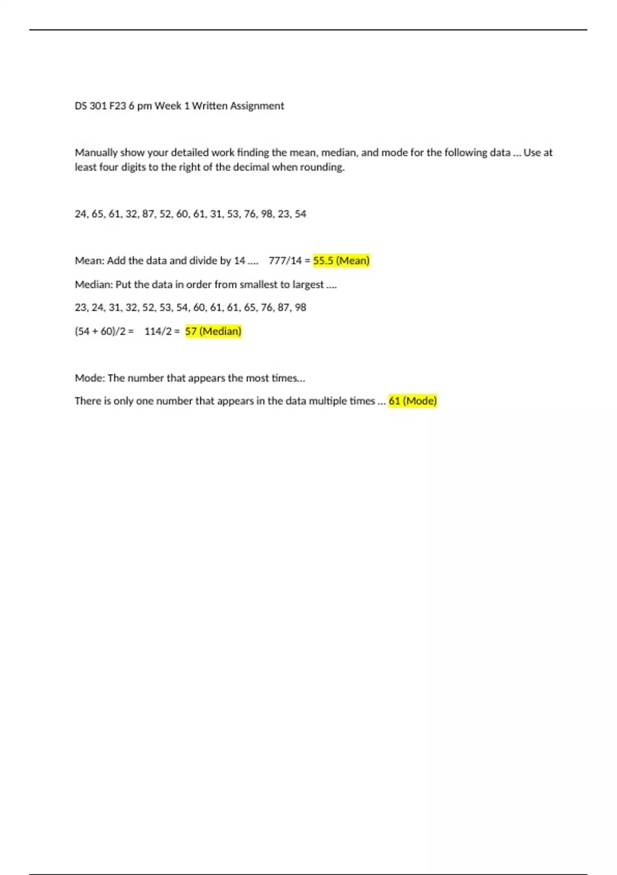 Study notes for in class assignments and homework for intro to bus stats, detailed step by step info on how to get the answers