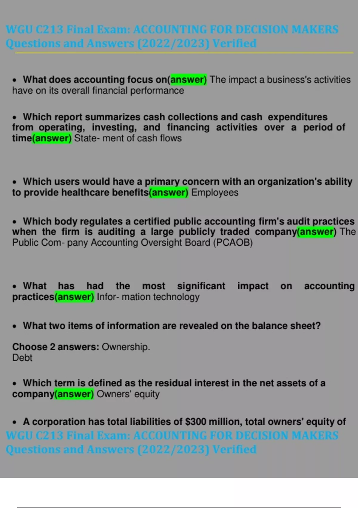 WGU C213 Final Exam Accounting for Decision Makers Questions and Answers (2023 / 2024) (Verified Answers) WGU C213 Final Exam Accounting for Decision Makers Questions and Answers (2023 / 2024) (Verified Answers)
