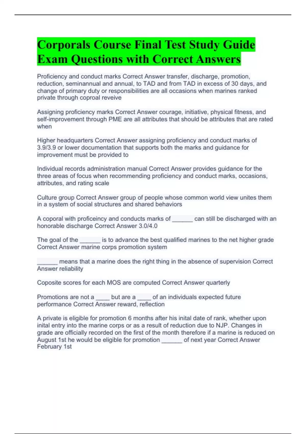 Corporals Course Final Test Study Guide Exam Questions with Correct Answers
