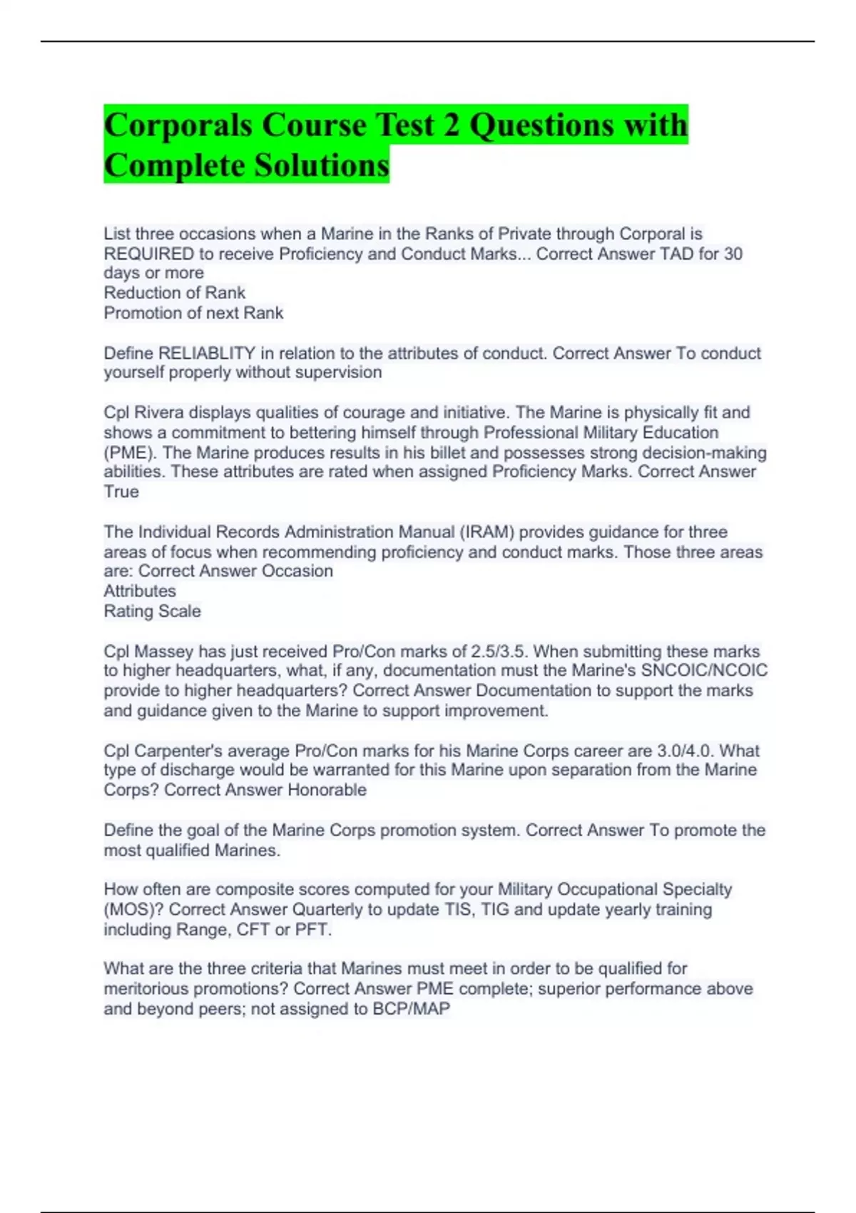 List three occasions when a Marine in the Ranks of Private through Corporal is REQUIRED to receive Proficiency and Conduct Marks... Correct Answer TAD for 30 days or more Reduction of Rank Promotion of next Rank Define RELIABLITY in relation to the attributes of conduct. Correct Answer To conduct yourself properly without supervision Cpl Rivera displays qualities of courage and initiative. The Marine is physically fit and shows a commitment to bettering himself through Professional Military Education (PME). The Marine produces results in his billet and possesses strong decision-making abilities. These attributes are rated when assigned Proficiency Marks. Correct Answer True The Individual Records Administration Manual (IRAM) provides guidance for three areas of focus when recommending proficiency and conduct marks. Those three areas are: Correct Answer Occasion Attributes Rating Scale Cpl Massey has just received Pro/Con marks of 2.5/3.5. When submitting these marks to higher headquarters, what, if any, documentation must the Marine's SNCOIC/NCOIC provide to higher headquarters? Correct Answer Documentation to support the marks and guidance given to the Marine to support improvement. Cpl Carpenter's average Pro/Con marks for his Marine Corps career are 3.0/4.0. What type of discharge would be warranted for this Marine upon separation from the Marine Corps? Correct Answer Honorable Define the goal of the Marine Corps promotion system. Correct Answer To promote the most qualified Marines. How often are composite scores computed for your Military Occupational Specialty (MOS)? Correct Answer Quarterly to update TIS, TIG and update yearly training including Range, CFT or PFT. What are the three criteria that Marines must meet in order to be qualified for meritorious promotions? Correct Answer PME complete; superior performance above and beyond peers; not assigned to BCP/MAP