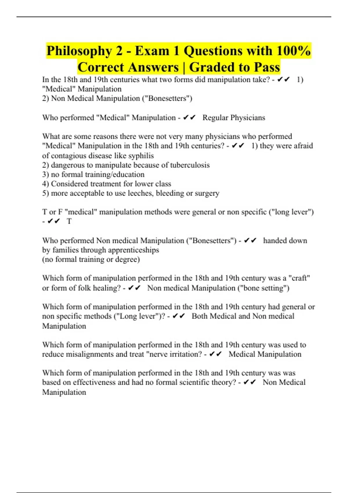 In the 18th and 19th centuries what two forms did manipulation take? - 1) "Medical" Manipulation 2) Non Medical Manipulation ("Bonesetters") Who performed "Medical" Manipulation - Regular Physicians What are some reasons there were not very many physicians who performed "Medical" Manipulation in the 18th and 19th centuries? - 1) they were afraid of contagious disease like syphilis 2) dangerous to manipulate because of tuberculosis 3) no formal training/education 4) Considered treatment for lower class 5) more acceptable to use leeches, bleeding or surgery T or F "medical" manipulation methods were general or non specific ("long lever") - T Who performed Non medical Manipulation ("Bonesetters") - handed down by families through apprenticeships (no formal training or degree) Which form of manipulation performed in the 18th and 19th century was a "craft" or form of folk healing? - Non medical Manipulation ("bone setting") Which form of manipulation performed in the 18th and 19th century had general or non specific methods ("Long lever")? - Both Medical and Non medical Manipulation Which form of manipulation performed in the 18th and 19th century was used to reduce misalignments and treat "nerve irritation? - Medical Manipulation Which form of manipulation performed in the 18th and 19th century was was based on effectiveness and had no formal scientific theory? - Non Medical Manipulation What were the two professions that emerged and carried on the practice of manipulation in the late 1800s - Osteopathic Medicine and Chiropractic Osteopathic medicine was founded by _______ in ______ who was originally a __________ - A.T Still, 1873, Medical Physician Osteopathic Medicine is based on manipulation of the body to ensure proper ________ to all parts of the body, restoring and maintaing health - Blood Flow Which of the two professions that carried on manipulation tended to have general or non specific manipulation - Osteopathic Medicine Which of the two professions that carried on manipulation felt that drugs and surgery could be used after manipulation was tried - Osteopathic Medicine ** Chiropractic was specific ("short lever") Chiropractic was founded by ___________ in ________ - D.D Palmer, 1895 Adjustment in Chiropractic was originally designed to ensure proper _____________ by correcting displacements of bones that were impinging on or interfering with nerved - Nervous system control of the body Who was - a lawyer who became a D.C - was an early friend gone rival of D.D and B.J - started his own chiropractic colleges in Oklahoma, Washington, Denver, New York - called himself the "Constructor - was named one of the "ten greatest Oklahomans" in 1922 - Dr. Willard Carver () Who was: - one of D.D's first 15 graduates in 1901 - Opened the American School of Chiropractic in Cedar Rapids - developed the first systematic curriculum and 2 year program - co author for first chiropractic Textbook "Modernized Chiropractic" - Started the first regular chiropractic Journal "The Backbone: - Founder and president of first professional Organization ACA - Dr. Solon Massey Langworthy Who was - The primary author of "Modernized Chiropractic" - went on to establish Naprapathy - Dr. Oakley Smith Who was -a pioneer woman chiropractor - was an editor of "Modernized Chiropractic" - May have been the first person to receive a chiropractic Licence under Illinois Medical Practice Act - Dr. Minora Paxson Who was: - an M.D/D.C who collaborated with D.D - authored 2 early books "Spinal Adjustment" and "Rational Therapy" - Dr. Alva Gregory Who was: - a PSC faculty - started National College of Chiropractic Which is now in Lombard Illinois named National University of Health Sciences - Dr. John Howard Who was: - A Carver CC grad - pioneered licensure effort in California - Dr. T.F. Ratledge Who was: - thought to be the first practicing chiropractor in canada; first of three chiropractic generations - Dr. Almeda Halderman Who was: - PSC grad - Only women to serve as president of National Chiropractic Association - Dr. Sylva Ashworth Who was: - the president of the National College of Chiropractic from - Dr. Joseph Janse Who was: - the author of "The Chiropractic Textbook" - B.J's Philosophy - Dr. R.W.Stephenson Who was: - a chiropractic philosopher, author and president of Texas Chiropractic college for a number of years? - Dr. William Harper Who was: - faculty member and president of Canadian Memorial Chiropractic College in Toronto - author of "Neurodynamics of the Vertebral Subluxation: - Dr. A.E.Homewood Who was: - a D.C from belgium (PSC grad) - Developer of motion palpation methods and fixation theory of subluxation - Dr. Henry Gillet Who was: - Founder of logan basic technique and logan college of chiropractic - Dr. H.B. Logan Who was: - Founder of Cleveland College of Chiropractic - Dr. Carl Cleavland Who was: - a 40 year faculty member and philosopher at PCC - 4th president of PCC from 1978-79 - Dr. Galen Price Who was: - Developer of Gonstead full spine technique - Dr. Clarence Gonstead Who was: - one of chiropractics leading academics and researchers - has M.D and PhD as well - author of major textbooks on Chiropractic - PCC grad '64 - Dr. Scott Haldeman Who was: - developer of Thompson terminal Point adjusting table ("drop" section adjusting table) and the Thompson Technique - - Dr. J. Clay Thompson Who Was: - The developer of the Applies Kinesiology technique - Dr. George Goodheart Who was: - chief of staff of B.J Palmer Research Clinic - Dr. Lyle Sherman Who was: - Founder of Sherman College of Straight Chiropractic - Dr. Thomas Gelardi Who was: - Mabel Palmers Nephew - long time PCC faculty Member - President of Los Angeles College of Chiropractic - Dr. W Heath Quigley Who was: - faculty member at PCC - 5th PCC president - Dr. J.F. McAndrews