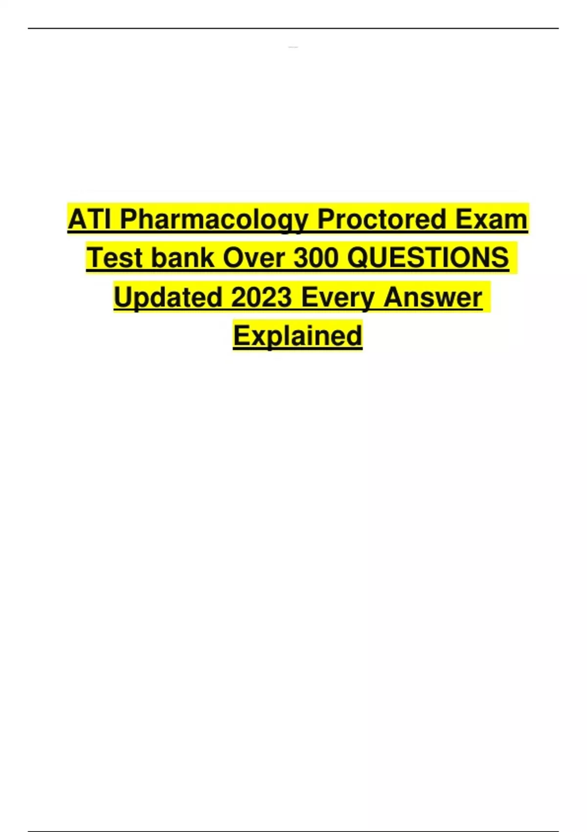 ATI Pharmacology Proctored Exam Test bank 1 1. A provider prescribes phenobarbital for a client who has a seizure disorder. The medication has a long half-life of 4 days. How many times per day should the nurse expect to administer this medication? A. One B. Two C. Three D. Four 2. A nurse educator is reviewing medication metabolism at an in-service presentation. Which of the followingfactors should the educator include as a reason to administer lower medication dosages? (Select all that apply.) A. Increased renal excretion B. Increased medication-metabolizing enzymesC. Liver failure D. Peripheral vascular disease E. Concurrent use of medication the same pathway metabolizes 3. A nurse is preparing to administer eye drops to a client. Which of the following actions should the nursetake? (Select all that apply.) A. Have the client lie on one side. B. Ask the client to look up at the ceiling. C. Tell the client to blink when the drops enter the eye. 4. A nurse is teaching a client about transdermal patches. Which of the following statements should the nurseidentify as an indication that the client understands? A. "I will clean the site with an alcohol swab before I apply the patch." lOM oAR cPS D| Downloaded by Valenzuela Tablet () B. "I will rotate the application sites weekly." C. "I will apply the patch to an area of skin with no hair." D. "I will place the new patch on the site of the old patch." 1 lOM oAR cPS D| Downloaded by Valenzuela Tablet () 5. A nurse reviewing a client's medical record notes a new prescription for verifying the trough level of theclient's medication. Which of the following actions should the nurse take? A. Obtain a blood specimen immediately prior to administering the next dose of medication. B. Verify that the client has been taking the medication for 24hr before obtaining a blood specimen. C. Ask the client to provide a urine specimen after the next dose of medication. D. Administer the medication, and obtain a blood specimen 30 min later. 6. A nurse is preparing a client's medications. Which the of following actions should the nurse take in followinglegal practice guidelines? (Select all that apply.) 2 lOM oAR cPS D| Downloaded by Valenzuela Tablet () A. Teach the client about the medication. B. Determine the dosage. C. Monitor for adverse effects. D. Lock compartments for controlled substances. E. Determine the client's insurance status. 7. A nurse is preparing to administer digoxin to a client who states, "I don't want to take that medication. I do not want one more pill." Which of the following responses should the nurse make? A. "Your physician prescribed it forso you really should take it." B. "Well, let's just get it over quickly then." you, C. "Okay, I'll just give you your other medications." D. "Tell me your concerns about taking this medication." 8. A nurse is reviewing a client's prescribed medications. Which of the following situations represents acontraindication to medication administration? A. The client drank grapefruit juice, which could reduce a medication's effectiveness. B. The medication has orthostatic hypotension as an adverse effect. C. A medication is approved for ages 12 and older, and the client is 8 years old. D. An antianxiety medication that has an adverse effect of drowsiness is prescribed as a preoperative sedative. 9. A nurse is assessing a client before administering medications. Which of the following data