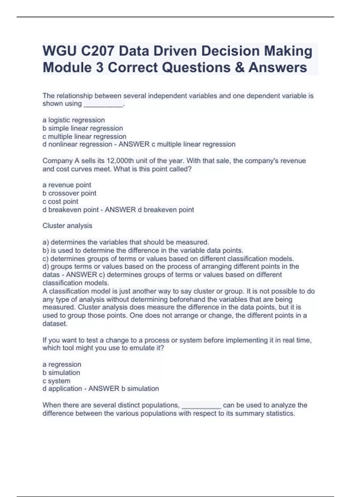 The relationship between several independent variables and one dependent variable is shown using __________. a logistic regression b simple linear regression c multiple linear regression d nonlinear regression - ANSWER c multiple linear regression Company A sells its 12,000th unit of the year. With that sale, the company's revenue and cost curves meet. What is this point called? a revenue point b crossover point c cost point d breakeven point - ANSWER d breakeven point Cluster analysis a) determines the variables that should be measured. b) is used to determine the difference in the variable data points. c) determines groups of terms or values based on different classification models. d) groups terms or values based on the process of arranging different points in the datas - ANSWER c) determines groups of terms or values based on different classification models. A classification model is just another way to say cluster or group. It is not possible to do any type of analysis without determining beforehand the variables that are being measured. Cluster analysis does measure the difference in the data points, but it is used to group those points. One does not arrange or change, the different points in a dataset. If you want to test a change to a process or system before implementing it in real time, which tool might you use to emulate it? a regression b simulation c system d application - ANSWER b simulation When there are several distinct populations, __________ can be used to analyze the difference between the various populations with respect to its summary statistics. a analysis of variance