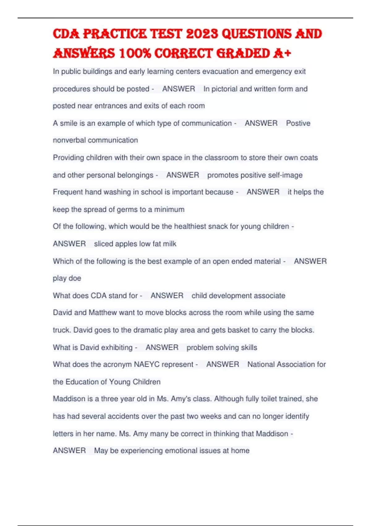 In public buildings and early learning centers evacuation and emergency exit procedures should be posted - ANSWER In pictorial and written form and posted near entrances and exits of each room A smile is an example of which type of communication - ANSWER Postive nonverbal communication Providing children with their own space in the classroom to store their own coats and other personal belongings - ANSWER promotes positive self-image Frequent hand washing in school is important because - ANSWER it helps the keep the spread of germs to a minimum Of the following, which would be the healthiest snack for young children - ANSWER sliced apples low fat milk