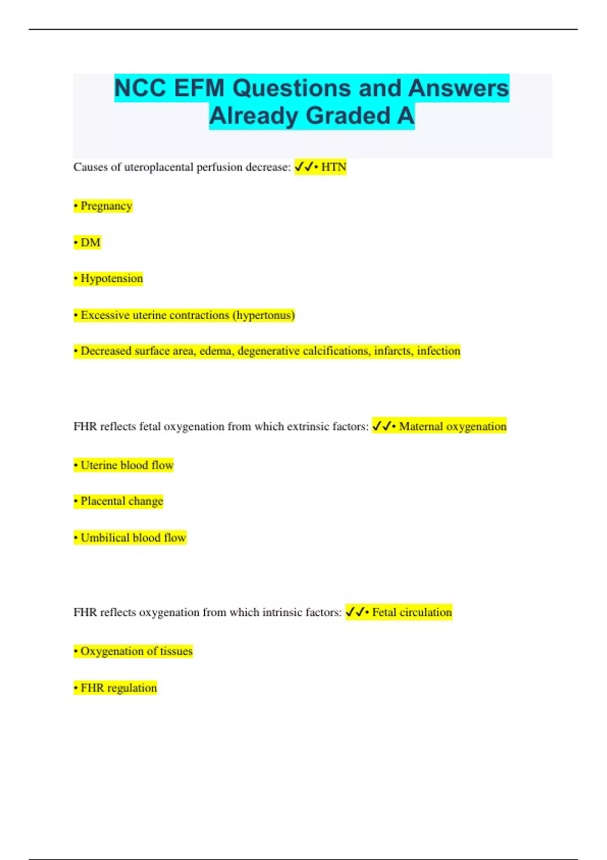 Causes of uteroplacental perfusion decrease: • HTN • Pregnancy • DM • Hypotension • Excessive uterine contractions (hypertonus) • Decreased surface area, edema, degenerative calcifications, infarcts, infection FHR reflects fetal oxygenation from which extrinsic factors: • Maternal oxygenation • Uterine blood flow • Placental change • Umbilical blood flow